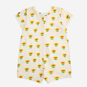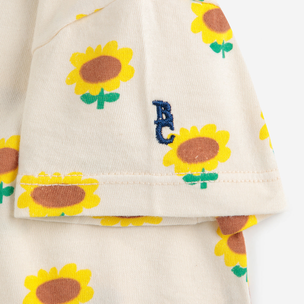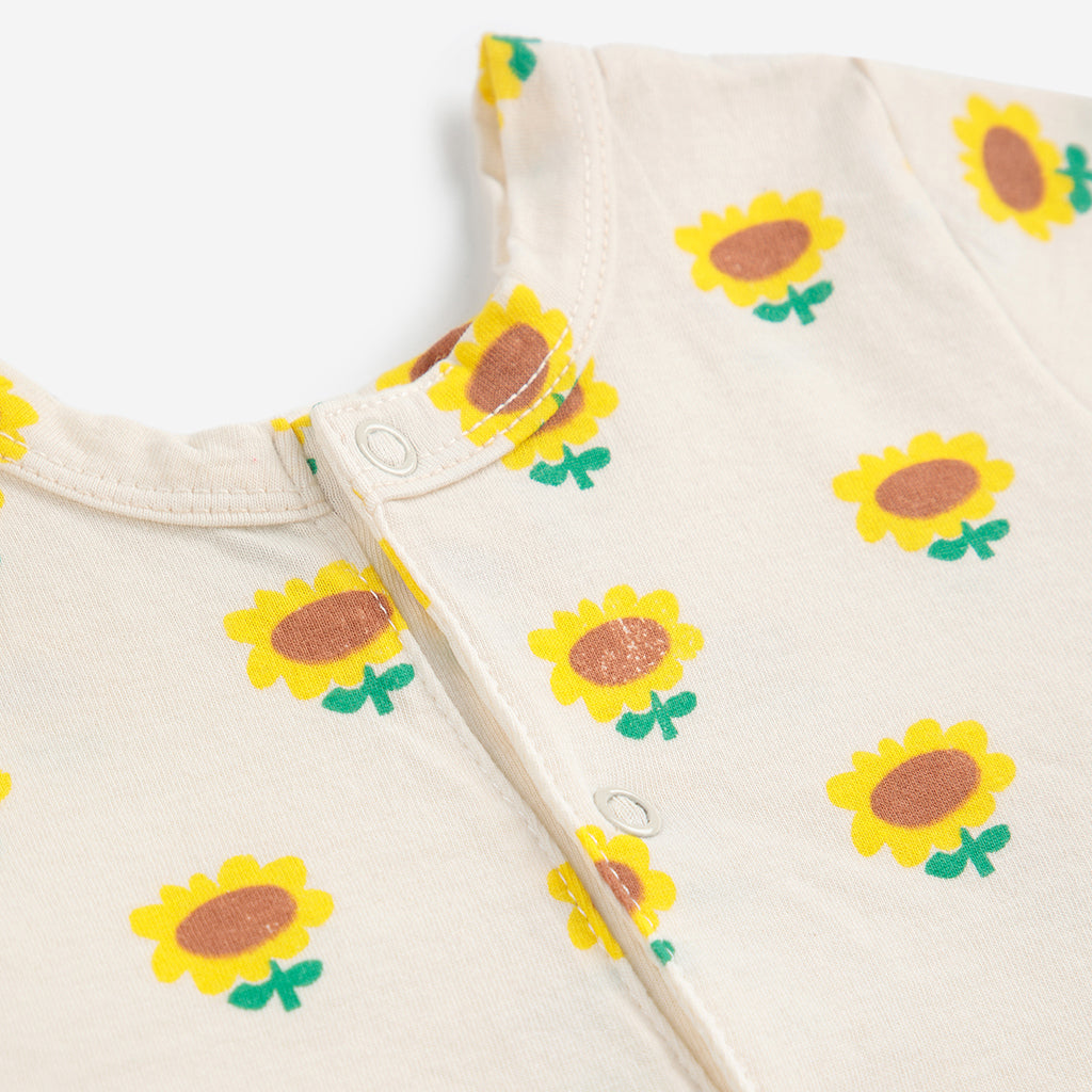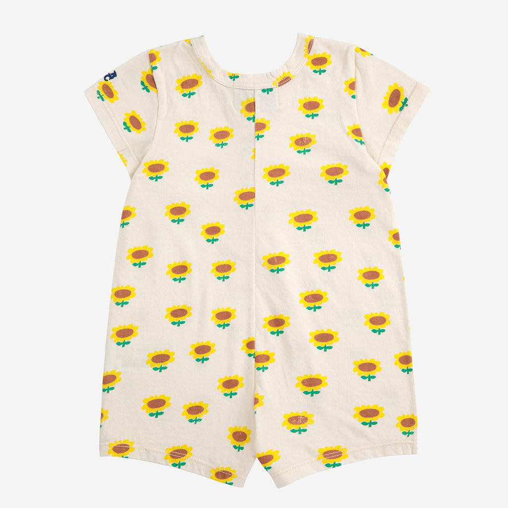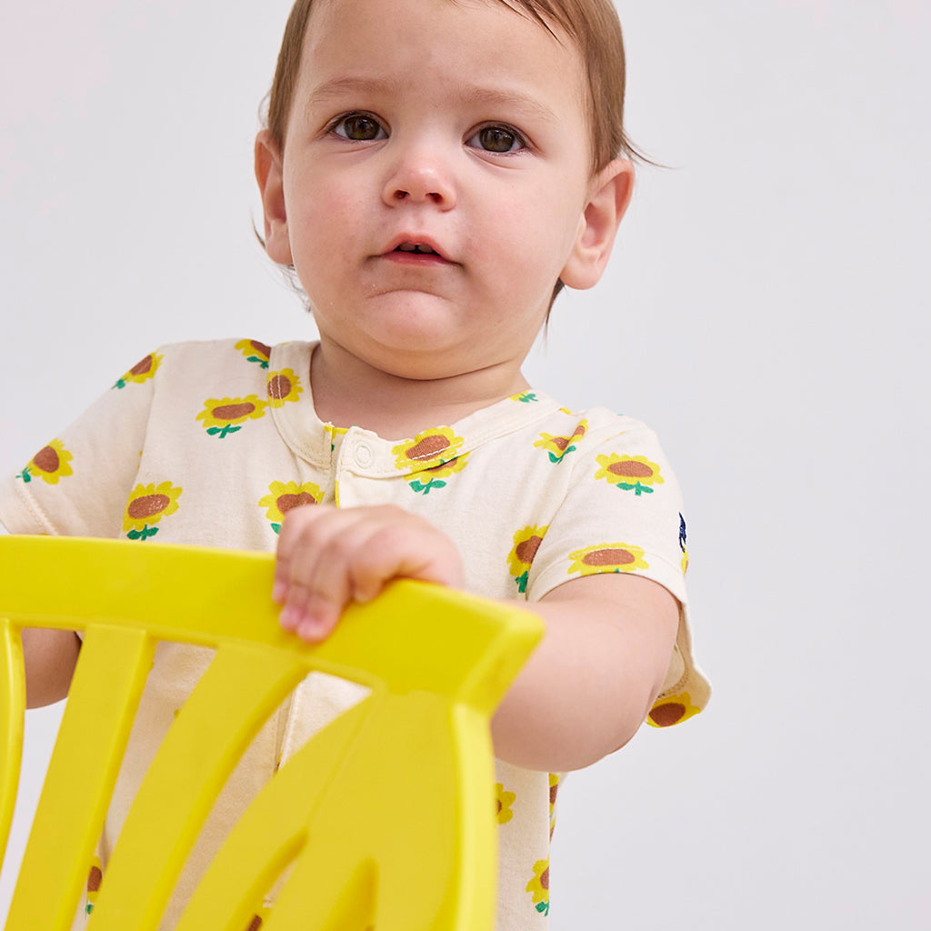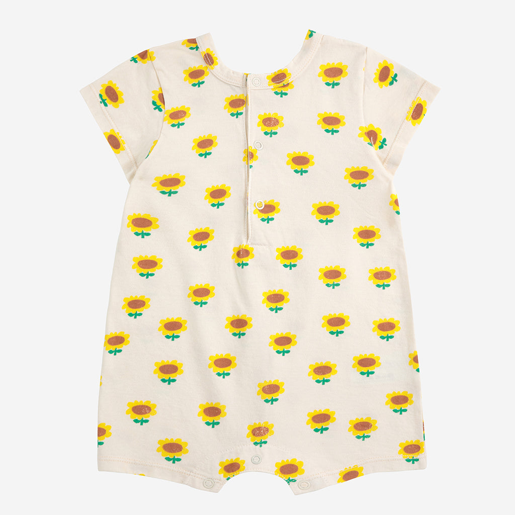 Verspielter Bobo Choses Strampler mit kurzen Armen und Beinen aus Bio-Baumwolle und mit Sunflower Allover Print und Druckknöpfen am Schritt und vorne.