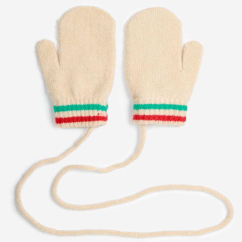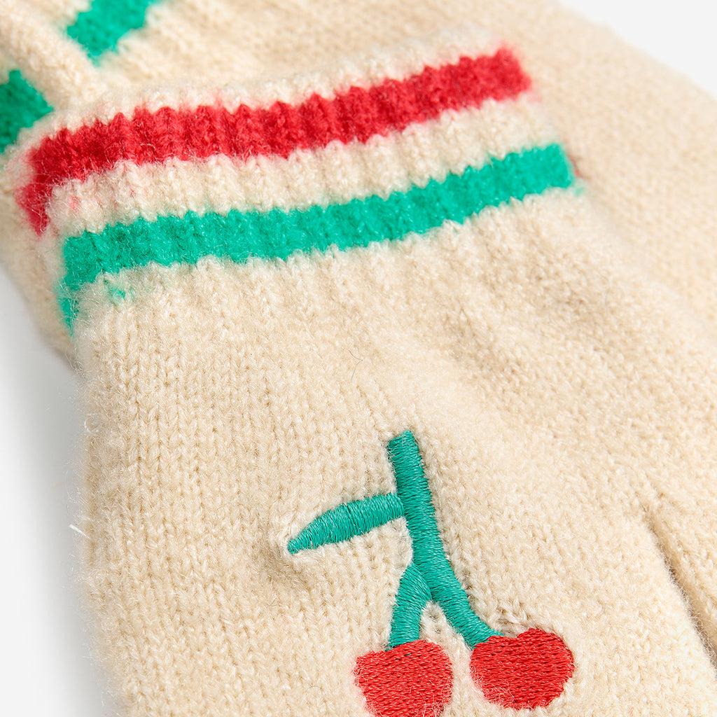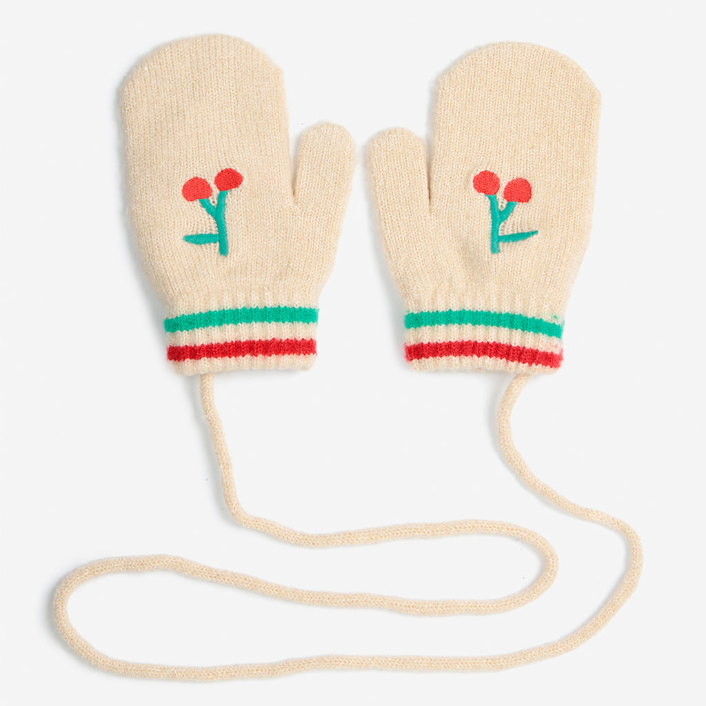 Zart-gestrickte Babyhandschuhe von Bobo Choses mit gestickter Kirsche und praktischem Bändel, damit sie nicht ständig runterfallen oder verloren gehen.