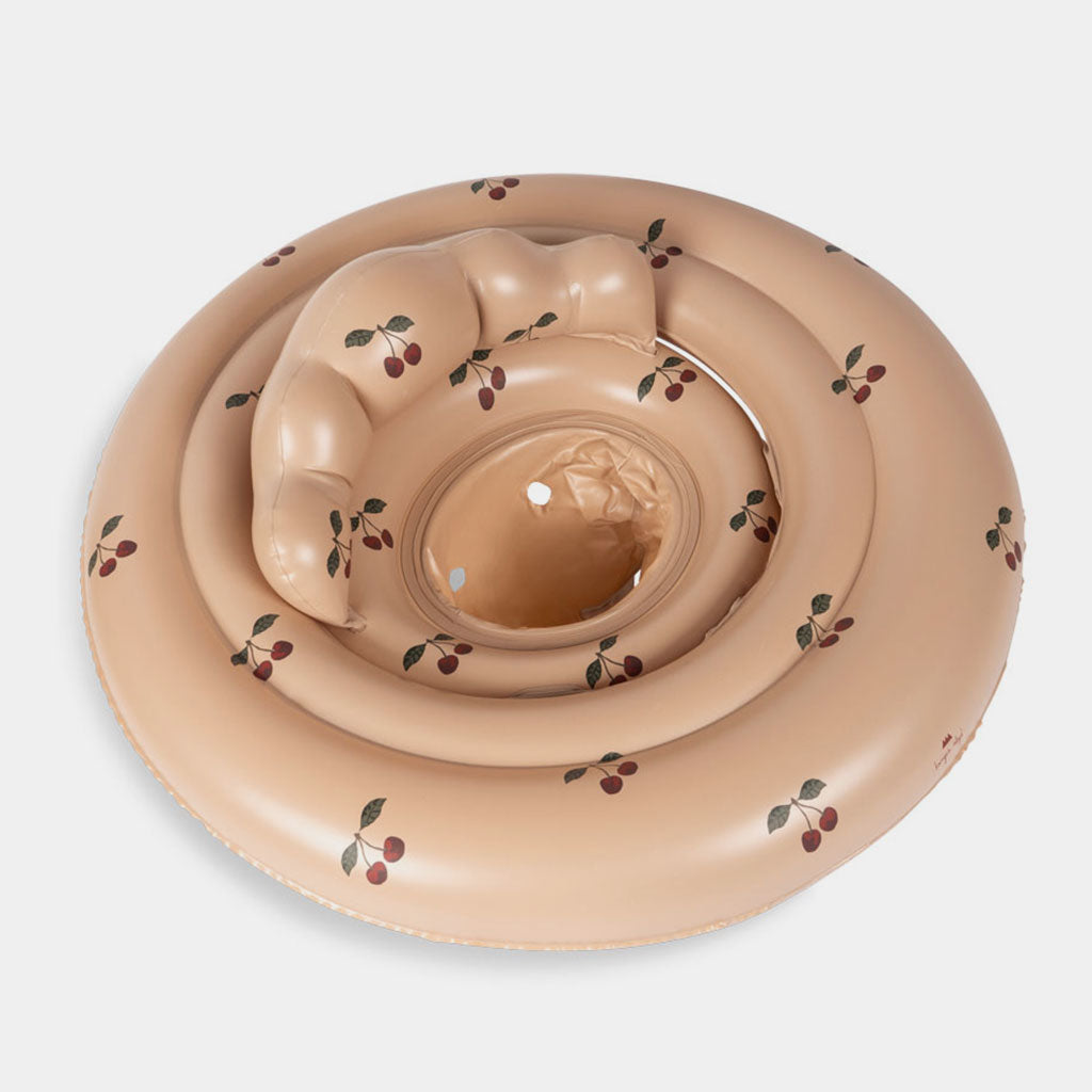 Aufblasbarer Babyschwimmring mit integriertem Babysitz und Rückenlehne sowie Löchern für die Beine.