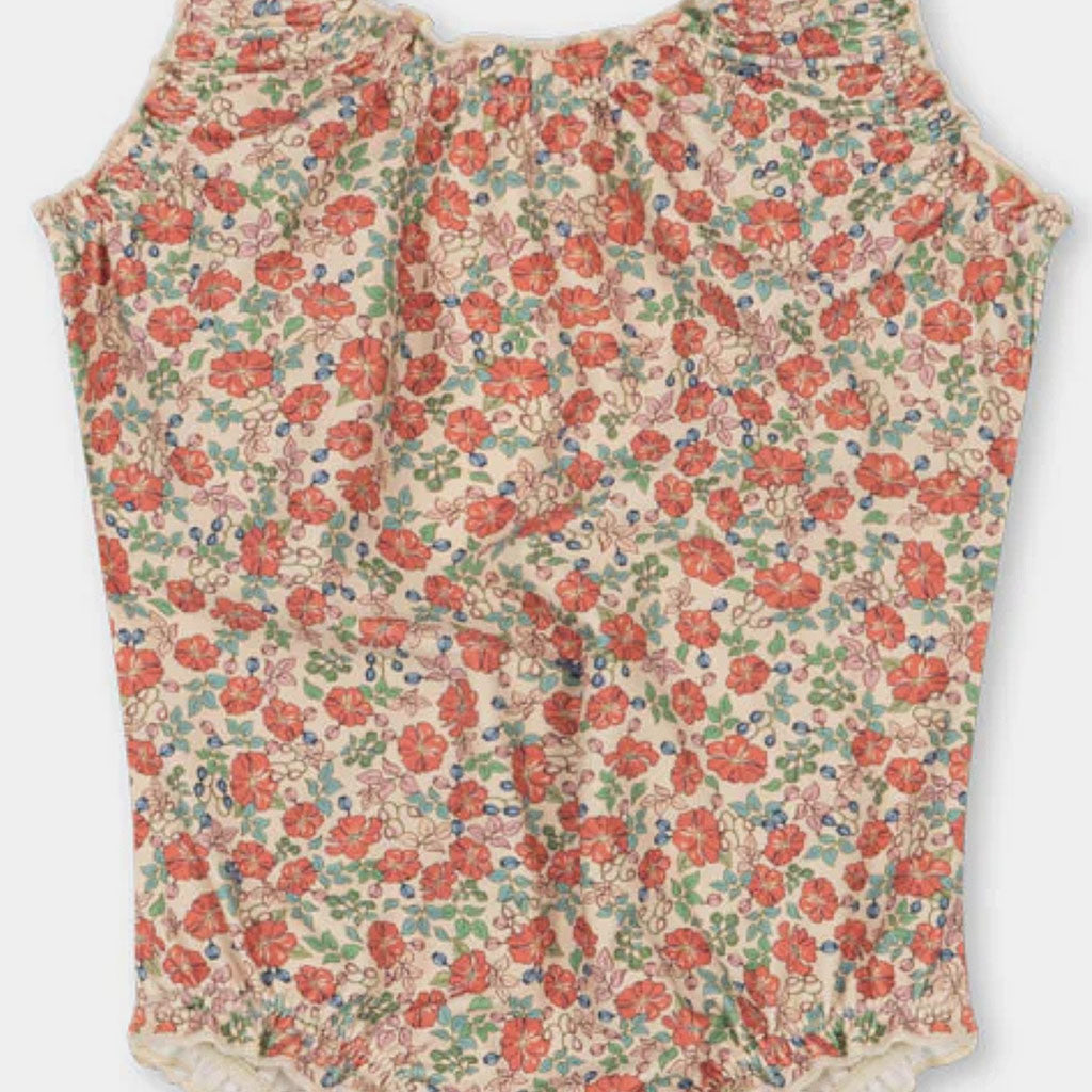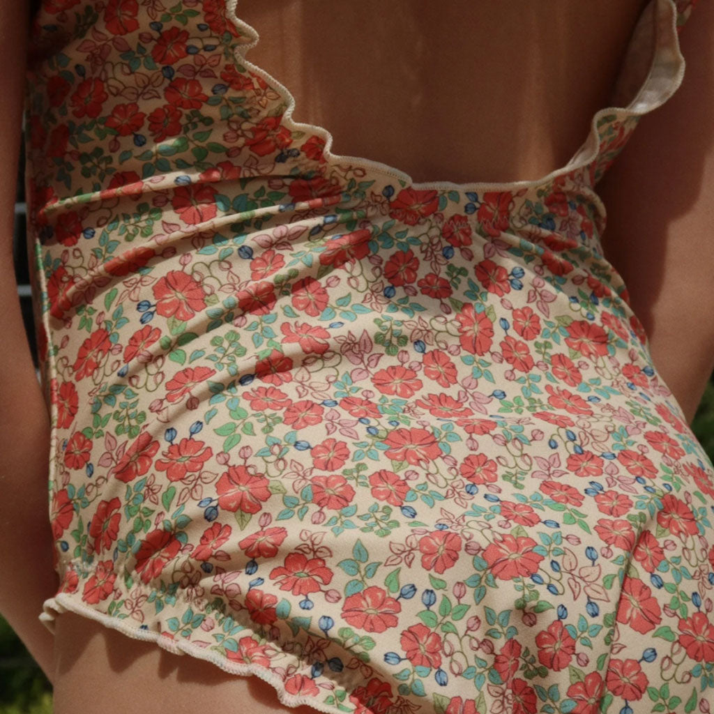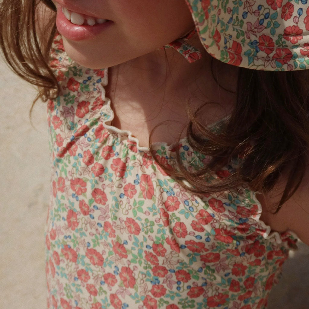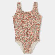 Romantischer Badeanzug aus weichem, angenehm dehnbarem Stoff mit Wellenmuster entlang der Nähte. Mit Druckknöpfen an den Beinöffnungen in den Größen 6m - 18m.