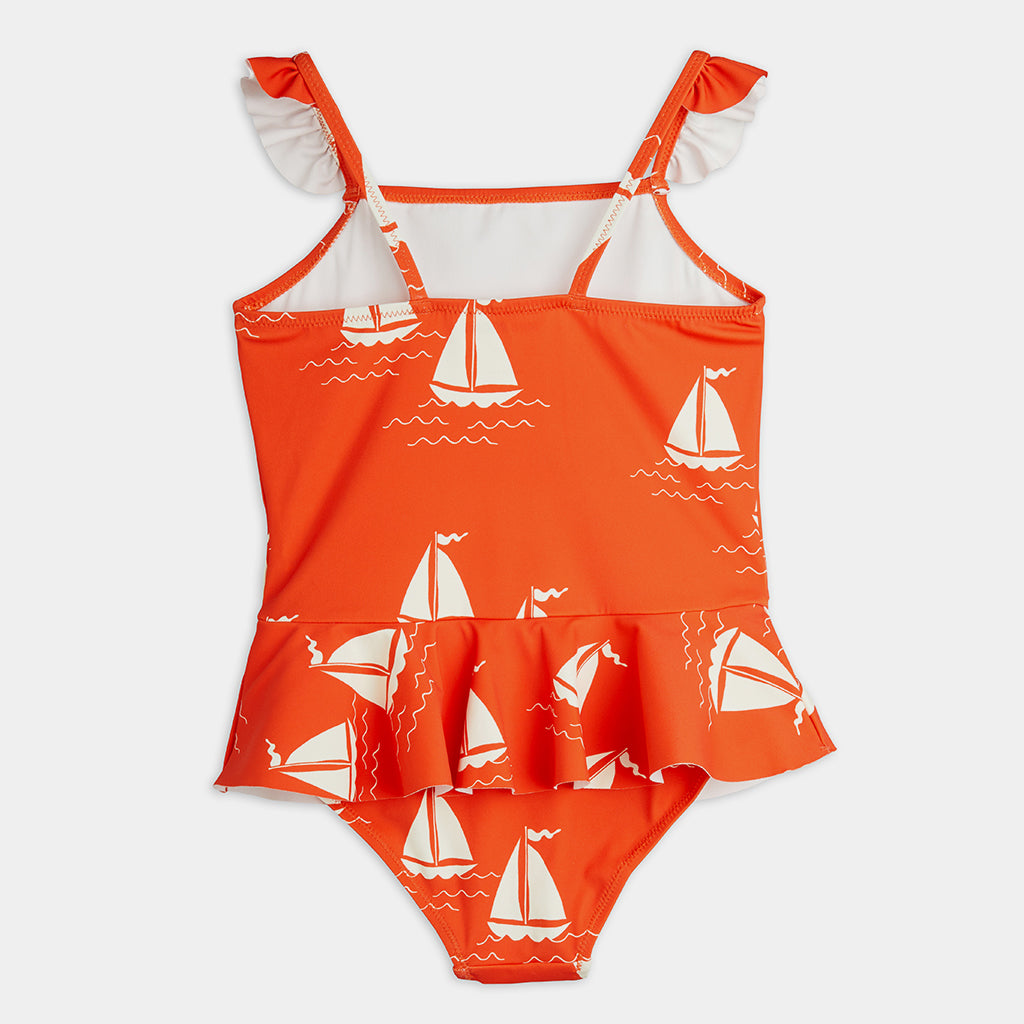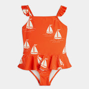 Roter Badeanzug von Mini Rodini mit kleinen, weissen Schiffen.