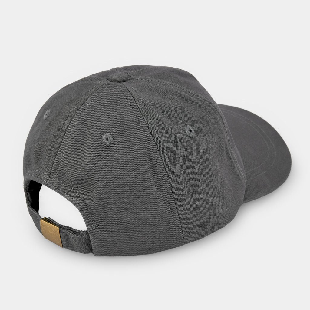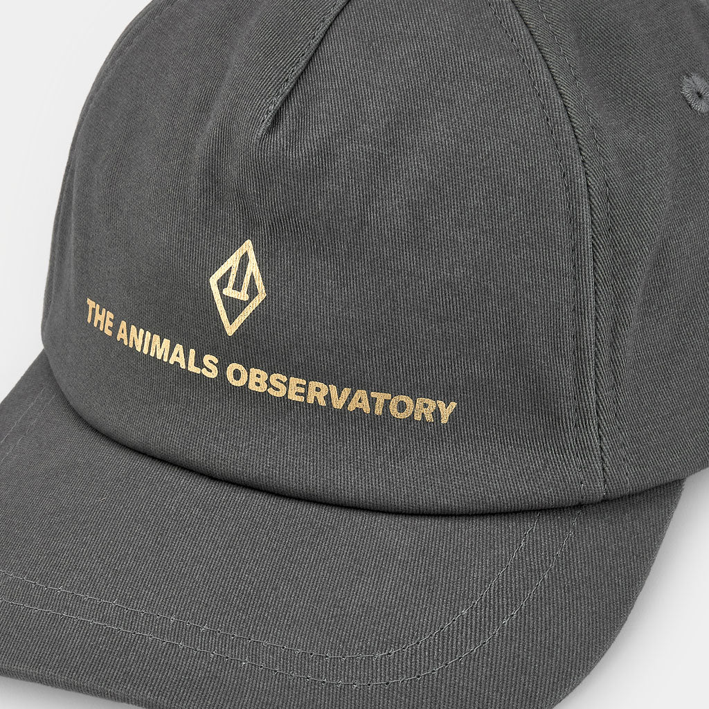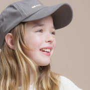 Diese dunkelgraue Mütze mit goldenem Logo setzt ein markantes Statement in modernen Kinderkollektionen.