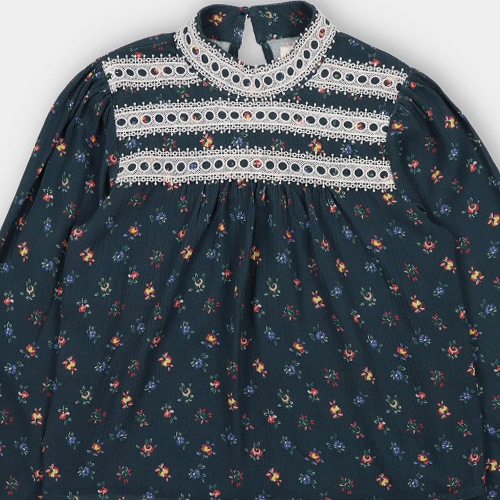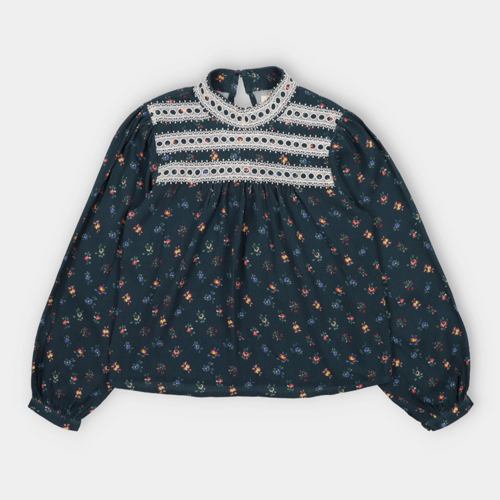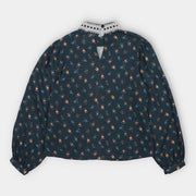 Verträumte Moon Bluse von The New Society mit exklusivem «Mini Blossom»-Druck in Midnight Navy. Die Bluse mit hohem Ausschnitt zeichnet sich durch Details aus roher Spitze, Biesen in der Mitte für zusätzliches Volumen und gewellten Ärmeln mit Raffungen an Schulter und Manschetten aus. Zusammen mit dem Jupe Moon ein Kombi zum Verlieben.