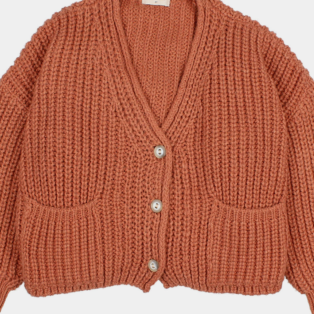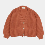 Weiche Trikot-Strickjacke mit Knöpfen, V-Ausschnitt und zwei Vordertaschen.