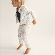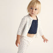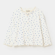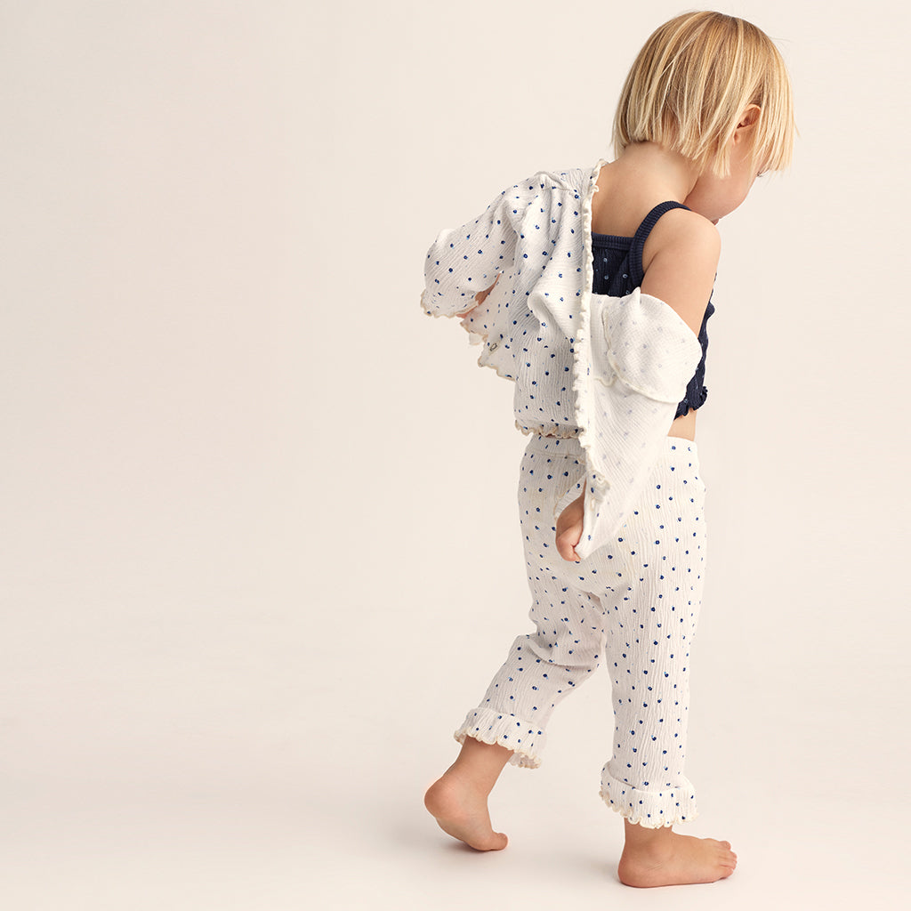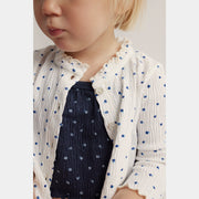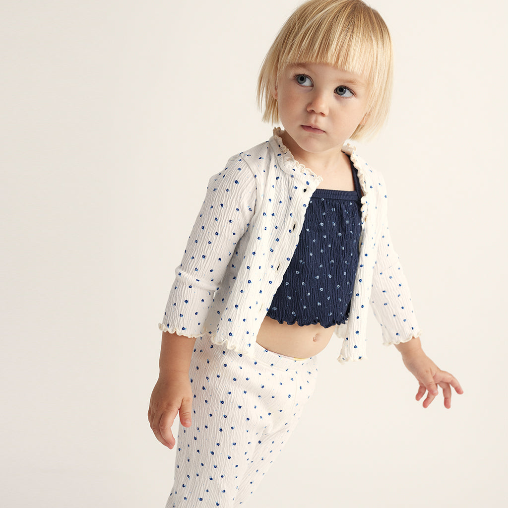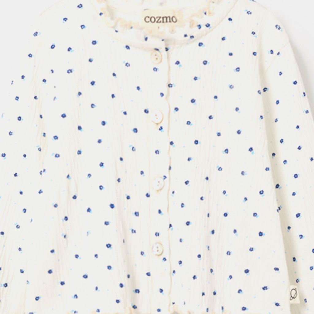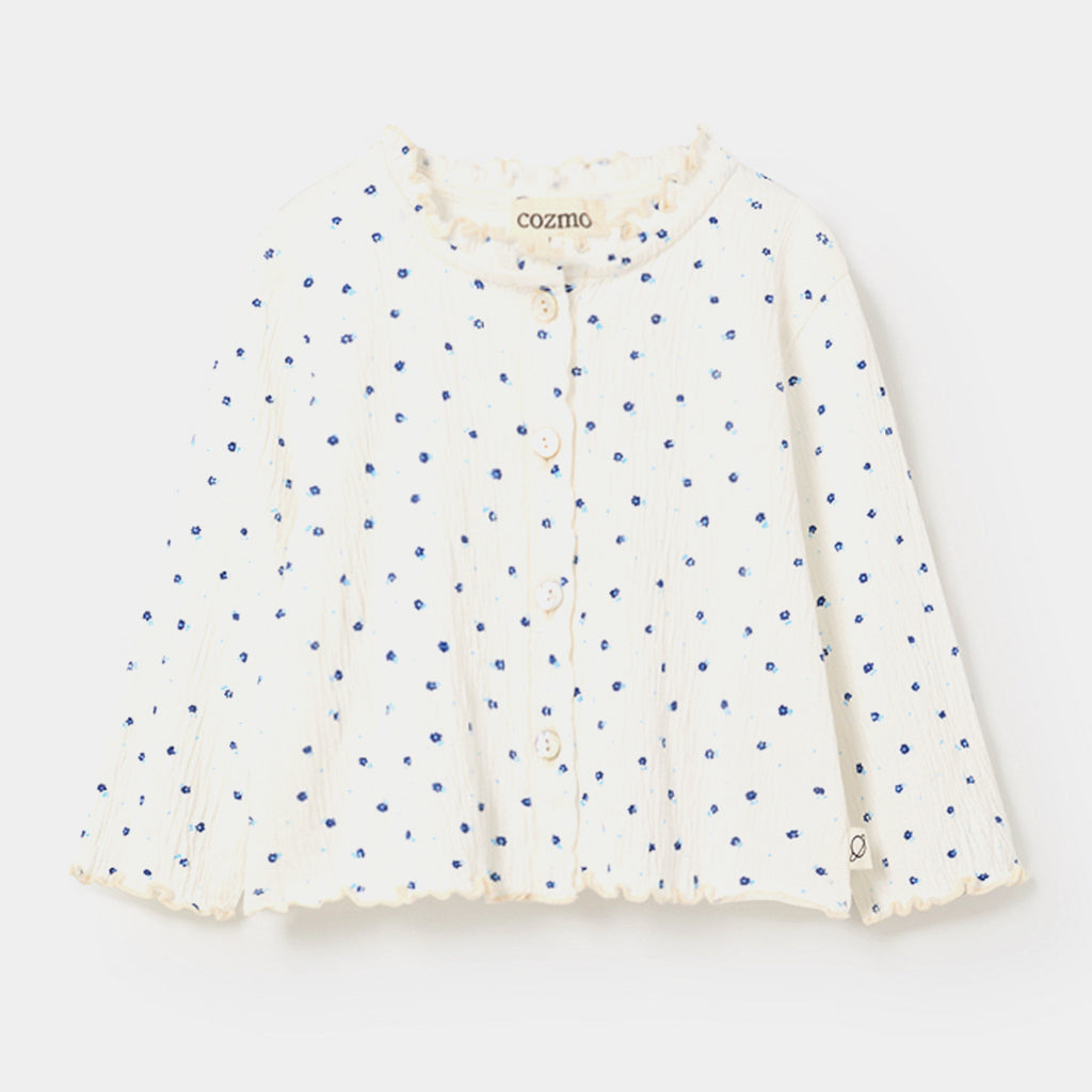 Jacke aus einer sehr leichten, elastischen Baumwollgaze. Gerüschter Stehkragen. Knöpfe auf der Vorderseite. Bündchen an den Ärmeln und am Saum. Natürlich zerknittert mit einem kleinen Blumenmuster.