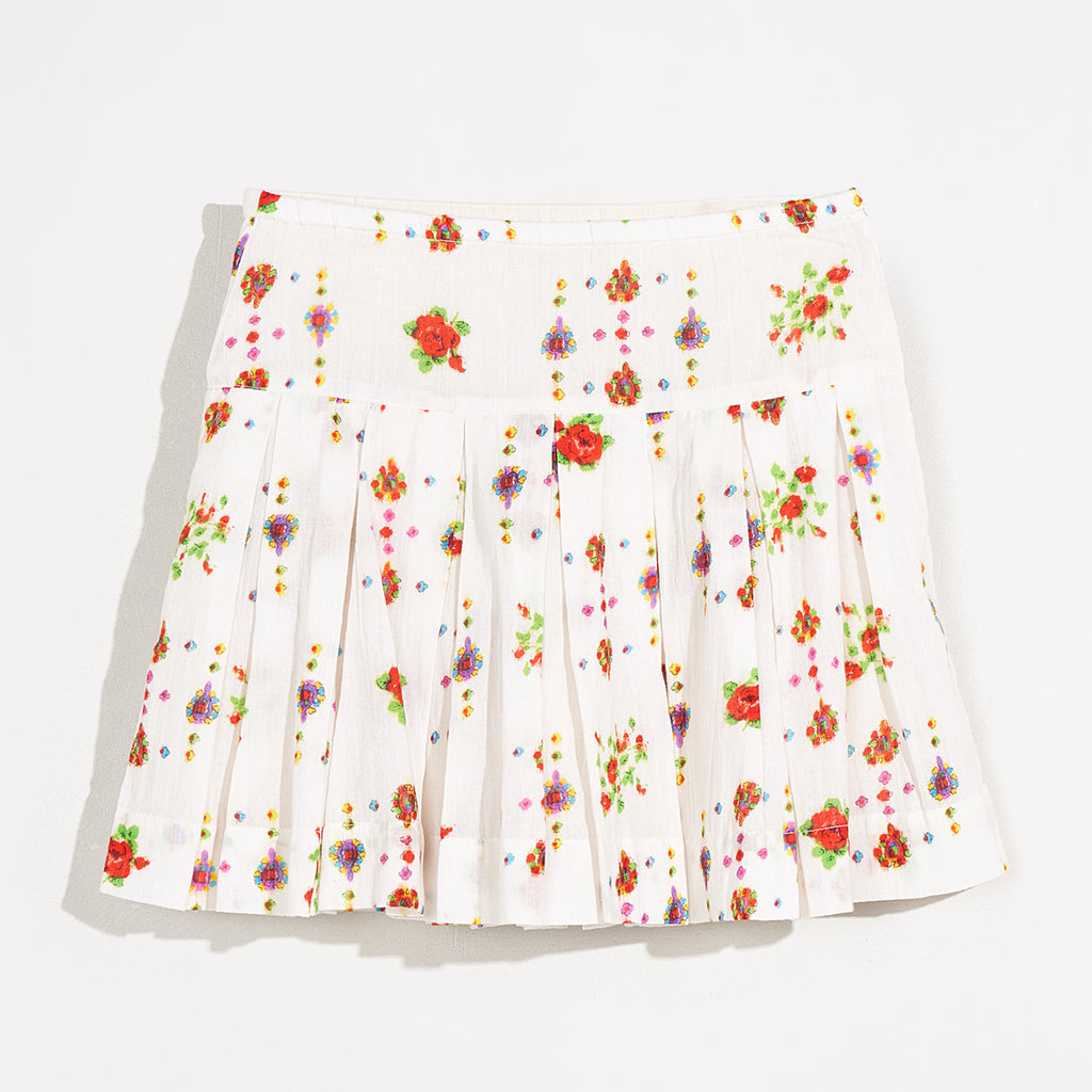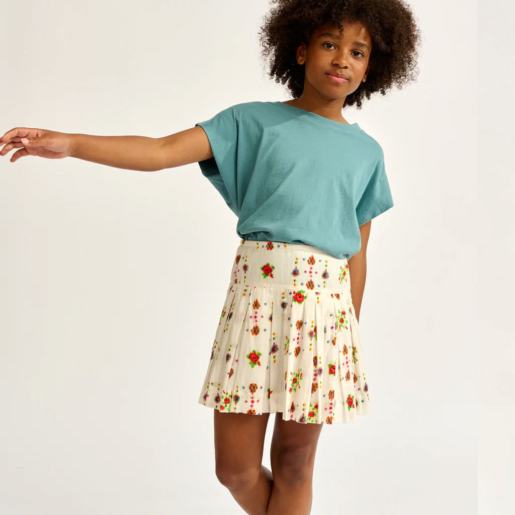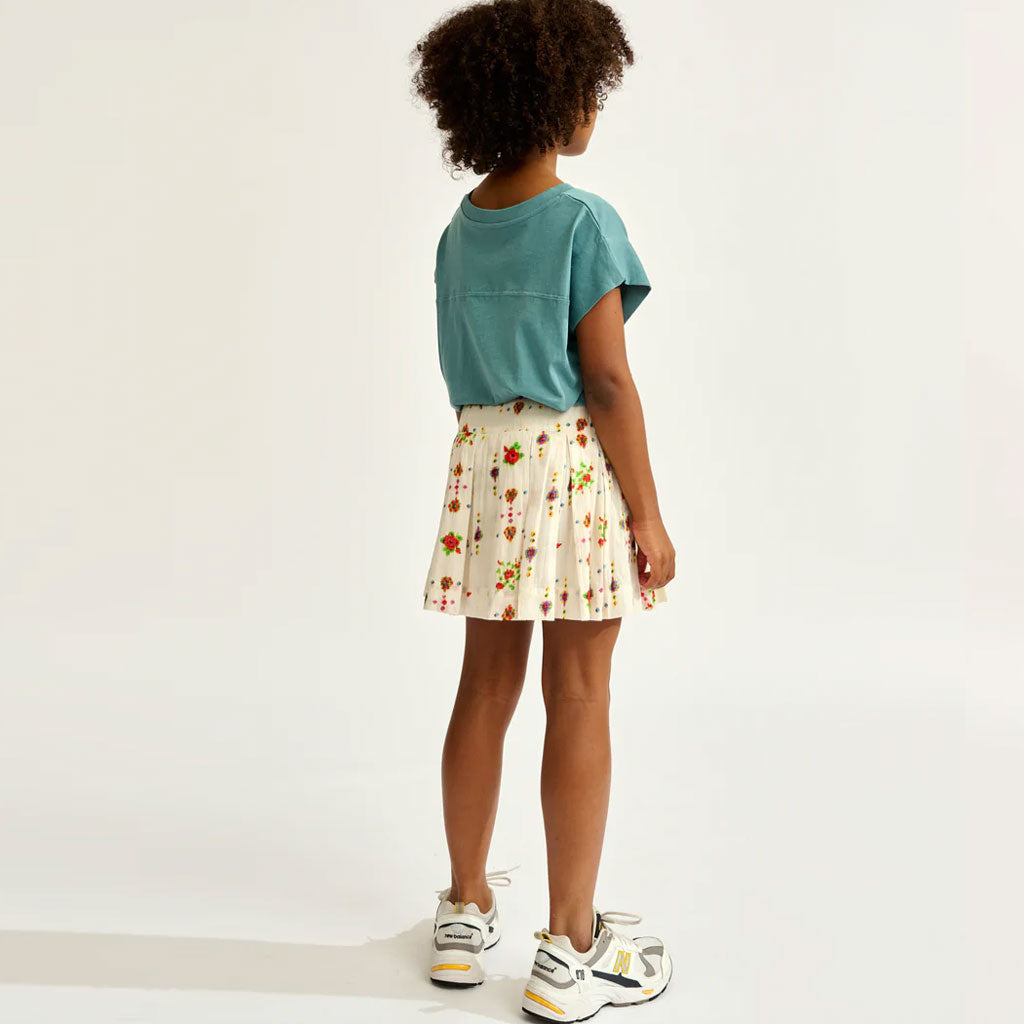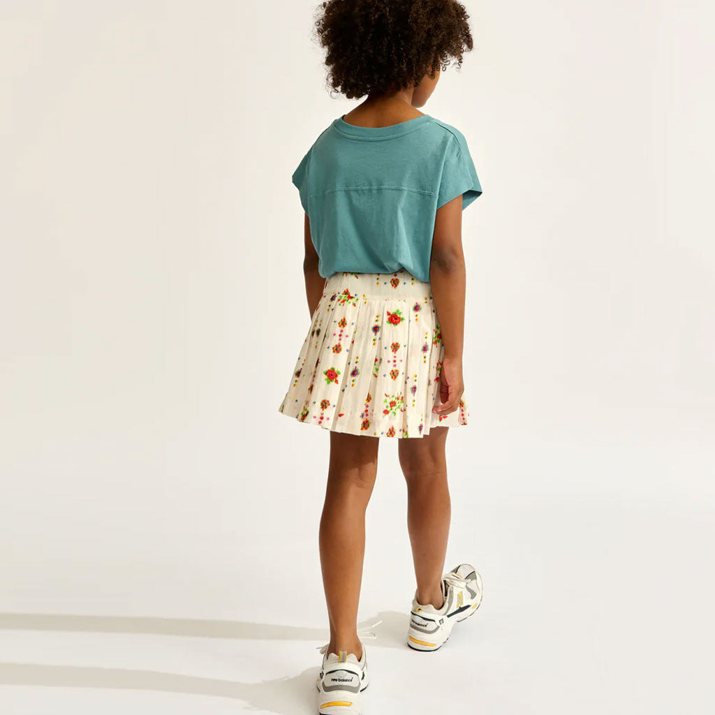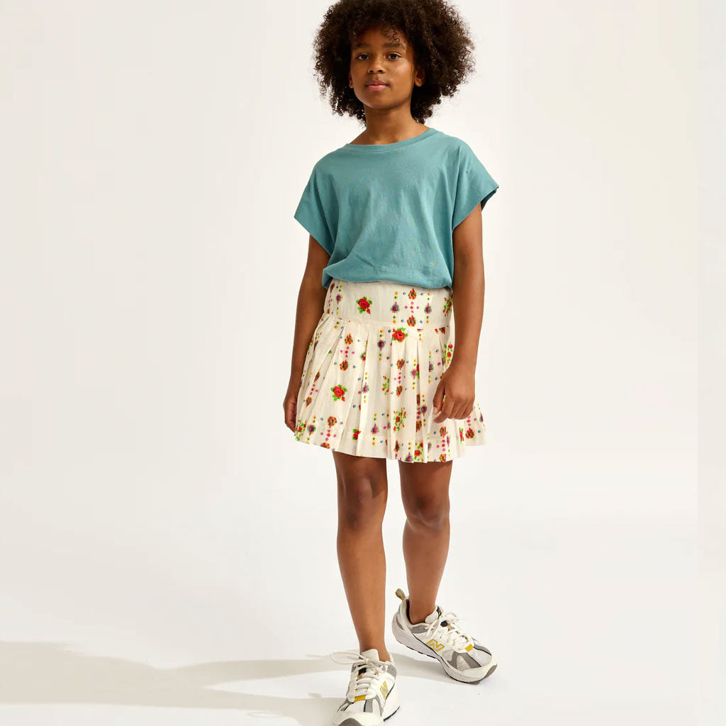 Die ausgestellte Silhouette und die breiten Falten des HAKA-Jupes von Bellerose machen ihn zu einem leicht zu tragenden Alltagsrock. Er ist aus reiner Baumwolle mit einem ethnisch inspirierten, mehrfarbigen Muster gefertigt und hat eine Minilänge, einen breiten Bund und eine fröhliche Ausstrahlung.
