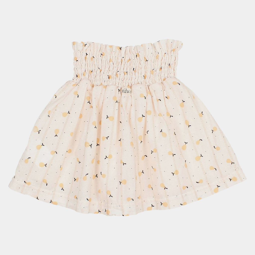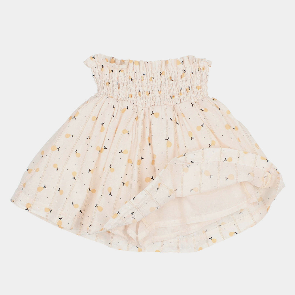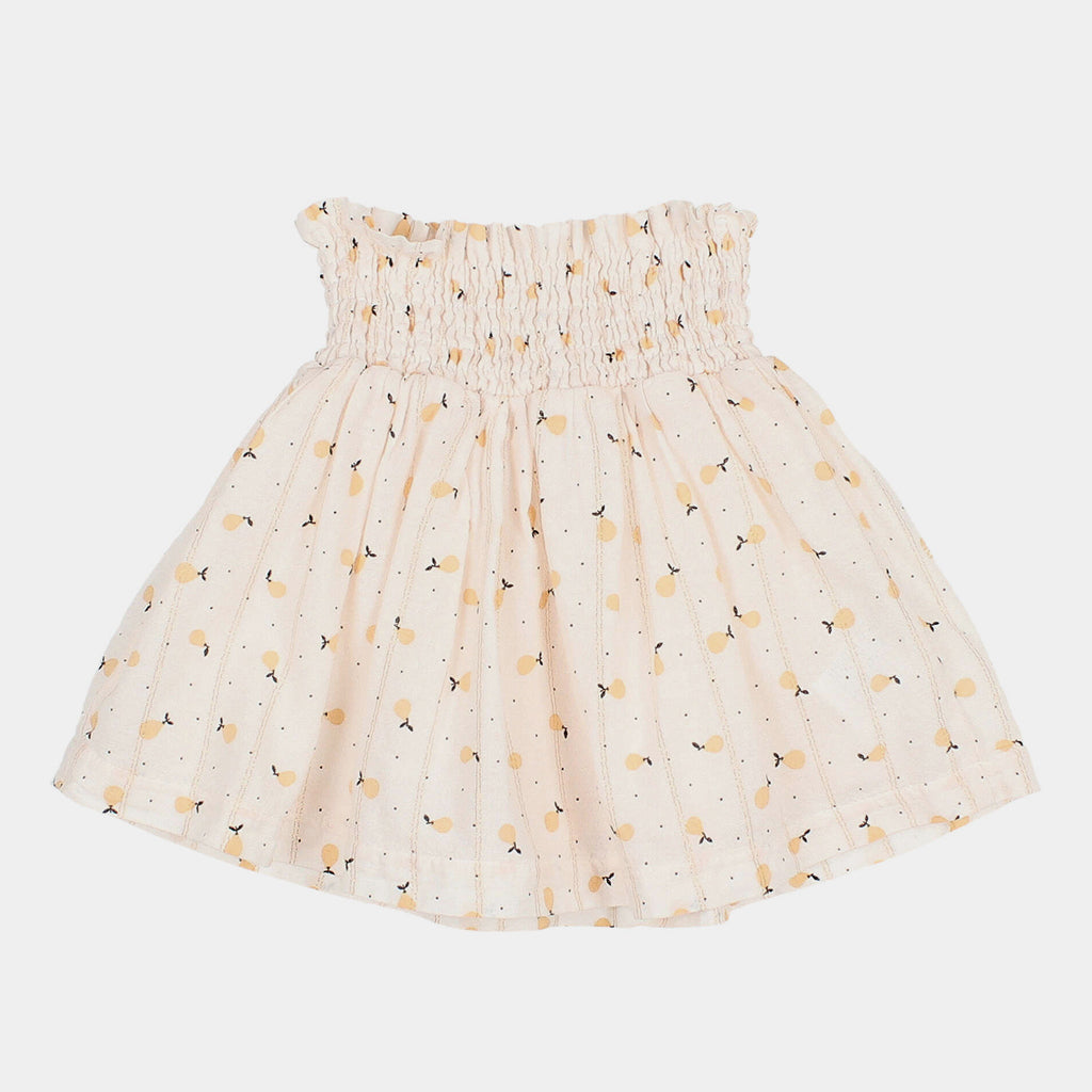 Luftiger Jupe mit süssem Birnendruck und elastischem Taillenbund.
