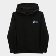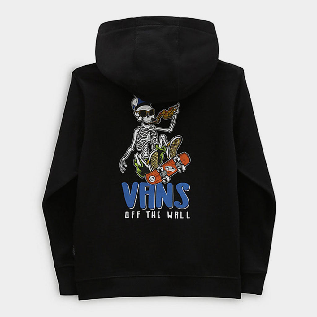 Pizza und Skaten - was will man mehr? Schwarzer Hoodie mit kleinem Druck vorne und pizzaessendem Skelett-Skater auf dem Rücken.