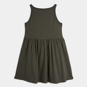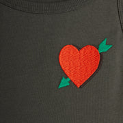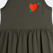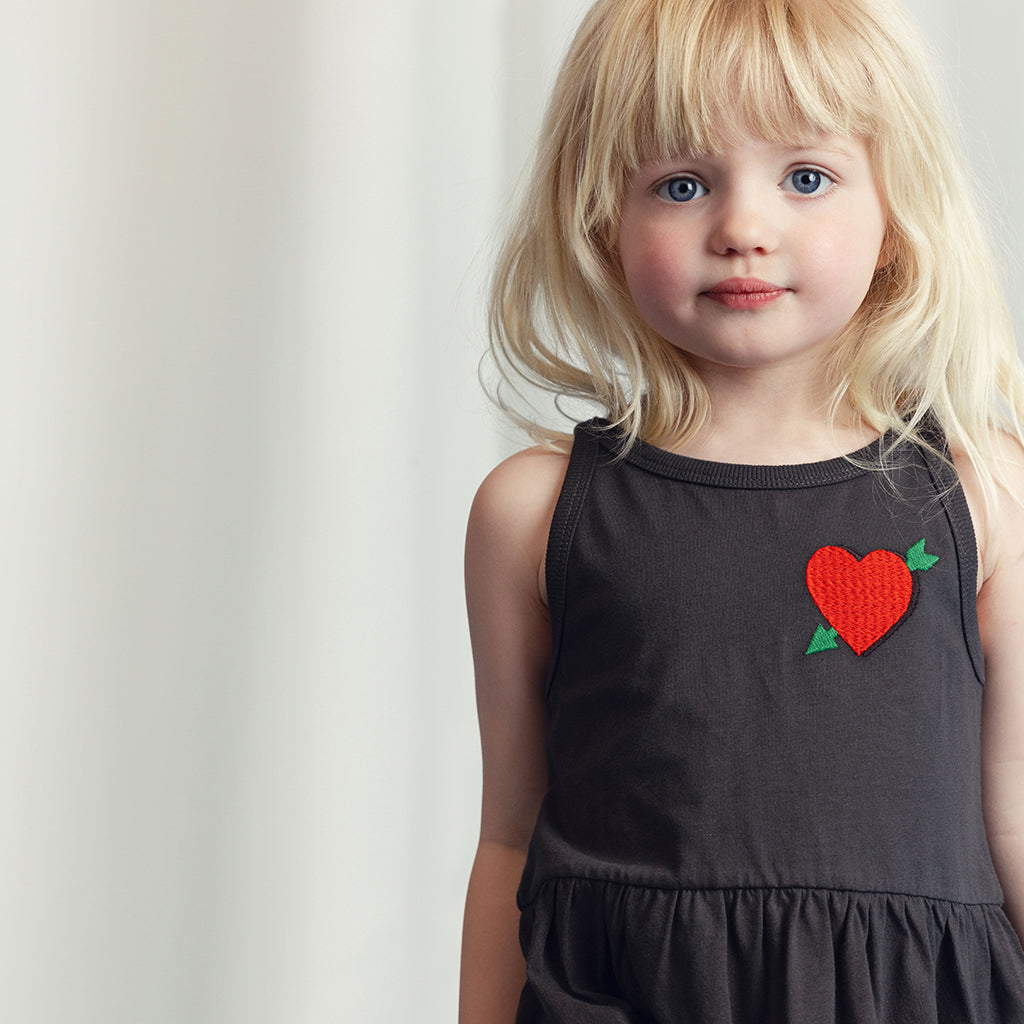 Schwarzes Mini Rodini Trägerkleid mit gesticktem, roten Herz, hergestellt aus 100% GOTS-zertifizierter Bio-Baumwolle.