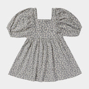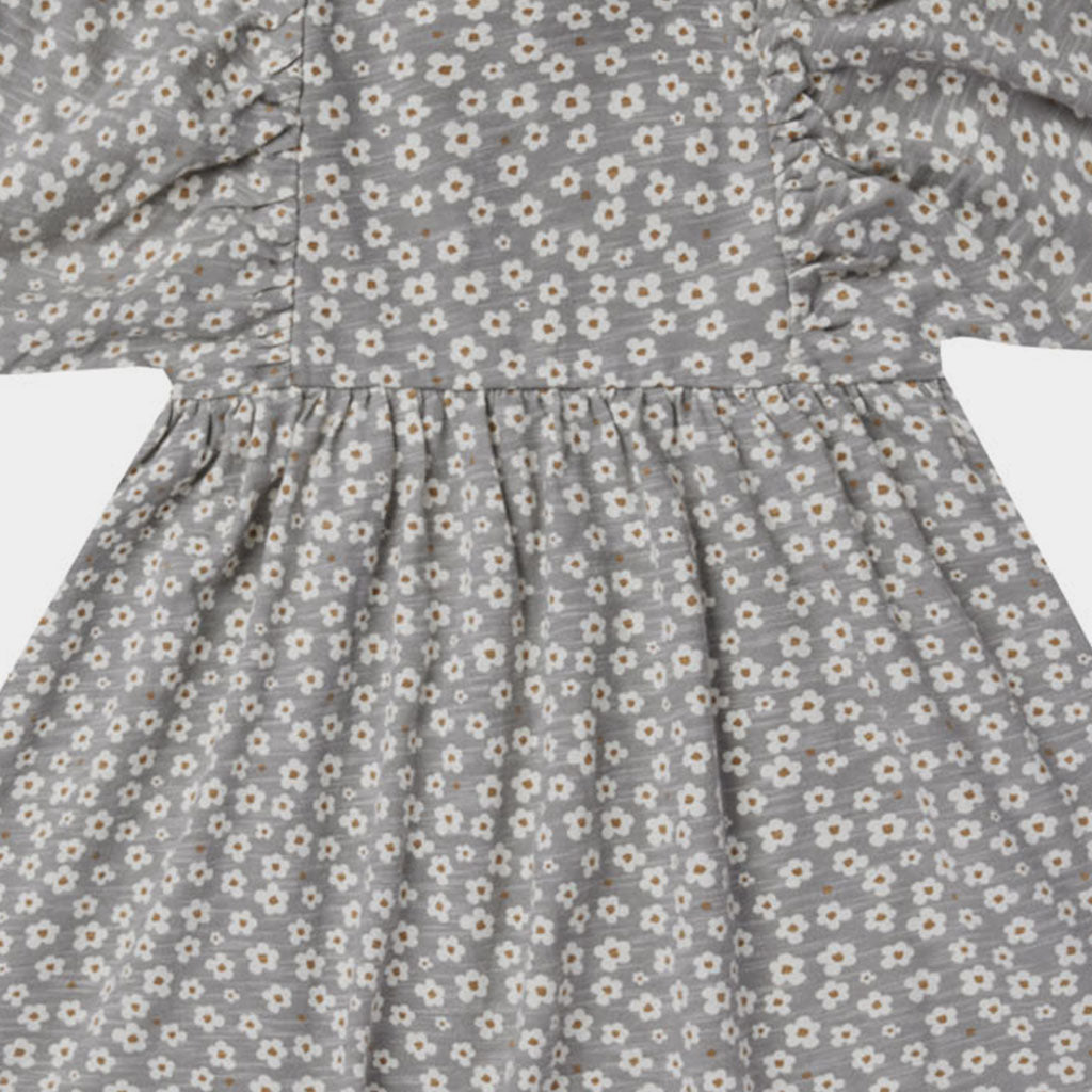 Eisblaues Kleid mit kleinen, weissen Blumen.