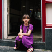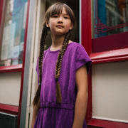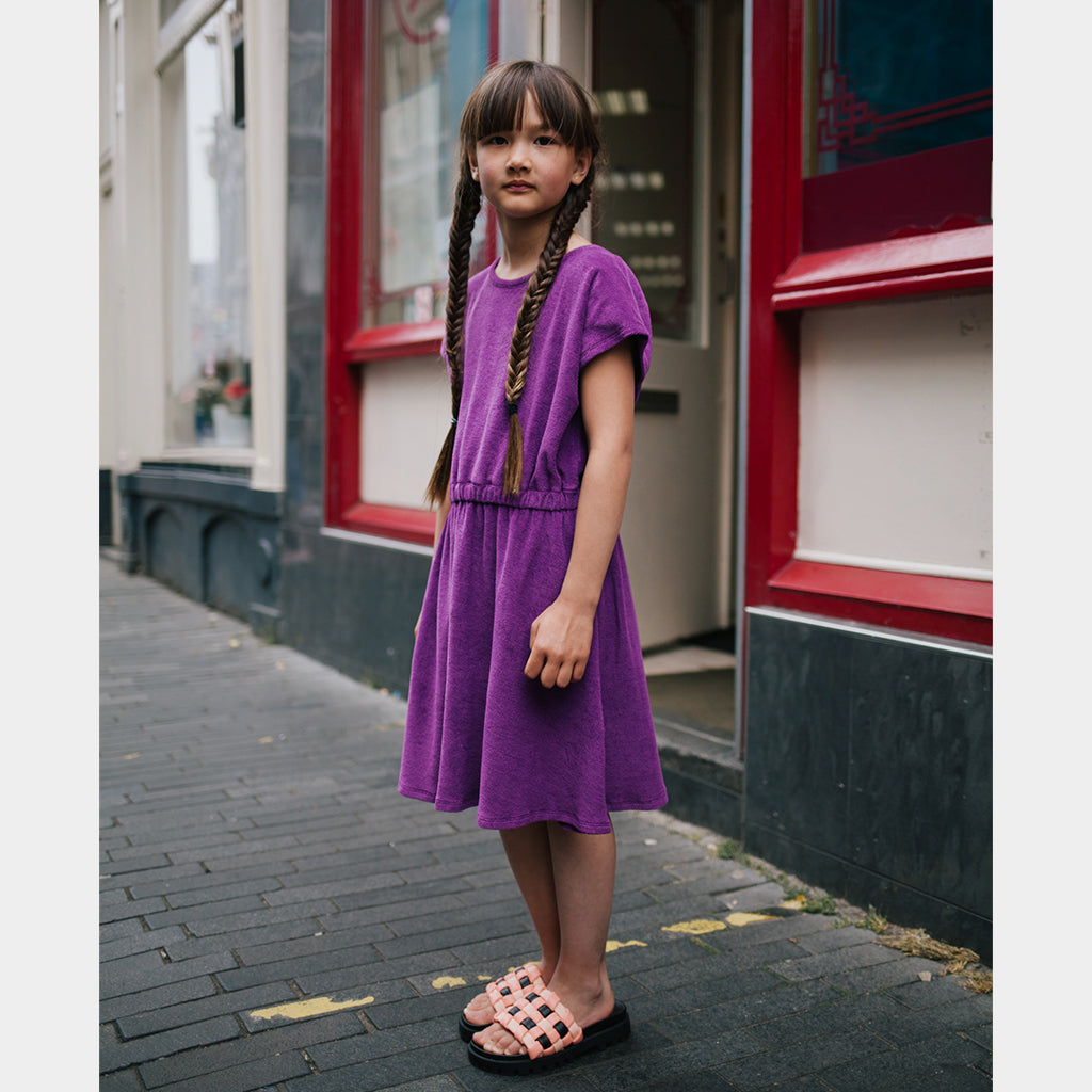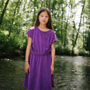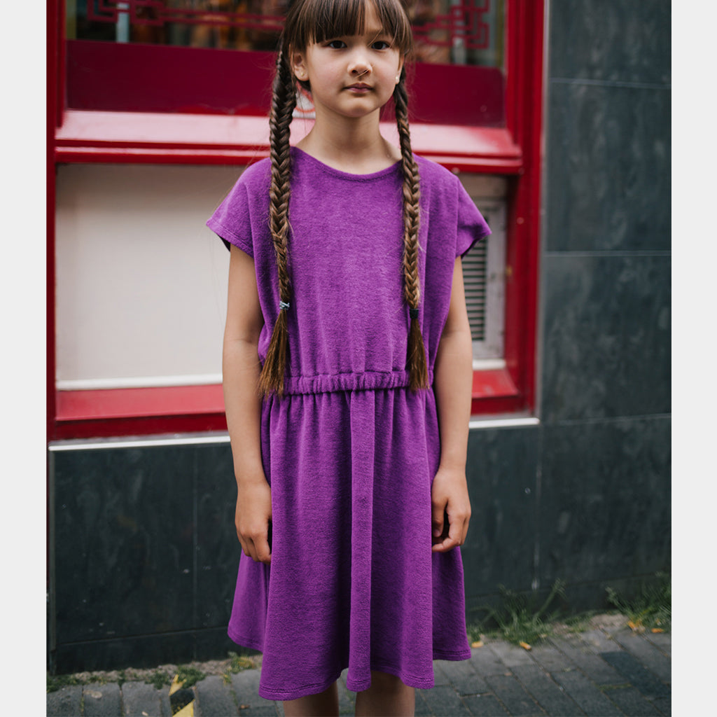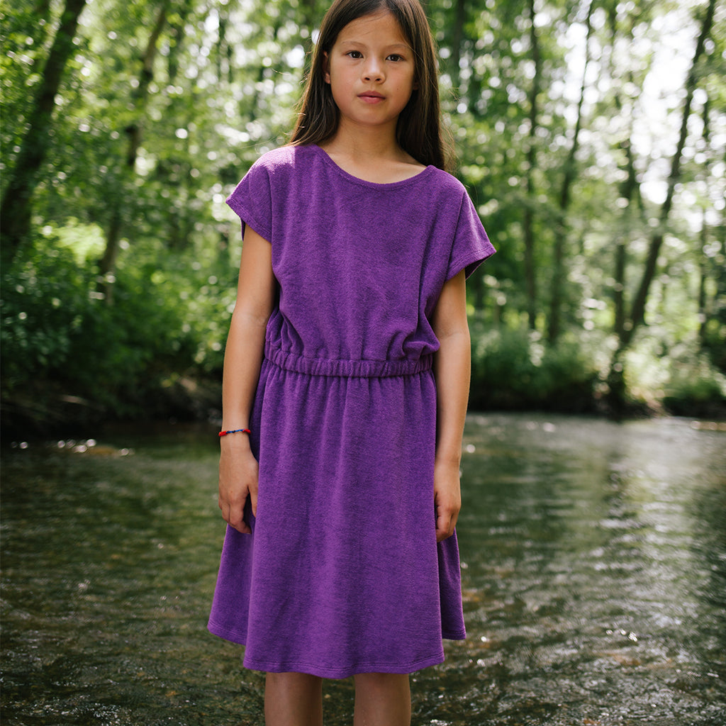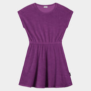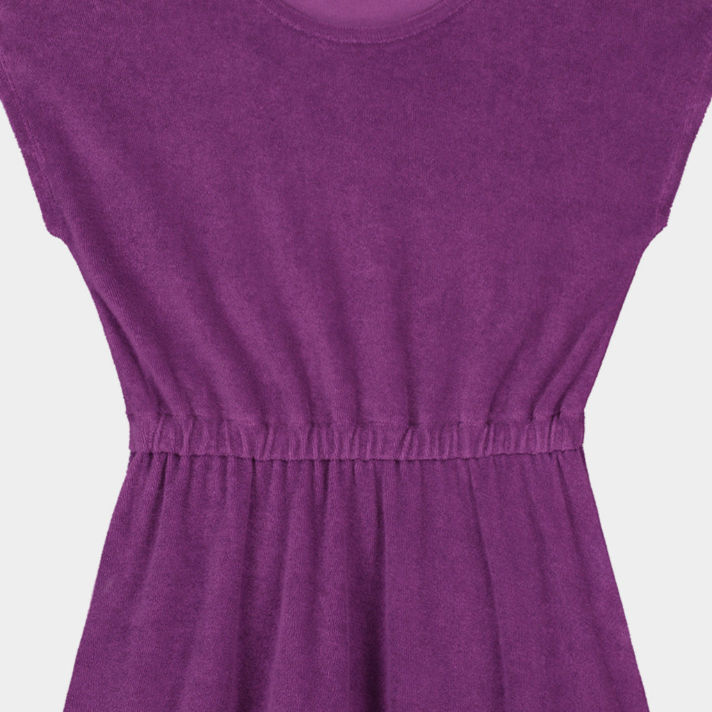 Kurzärmeliges, violettes Frotteekleid mit elastischem Taillenbund.