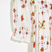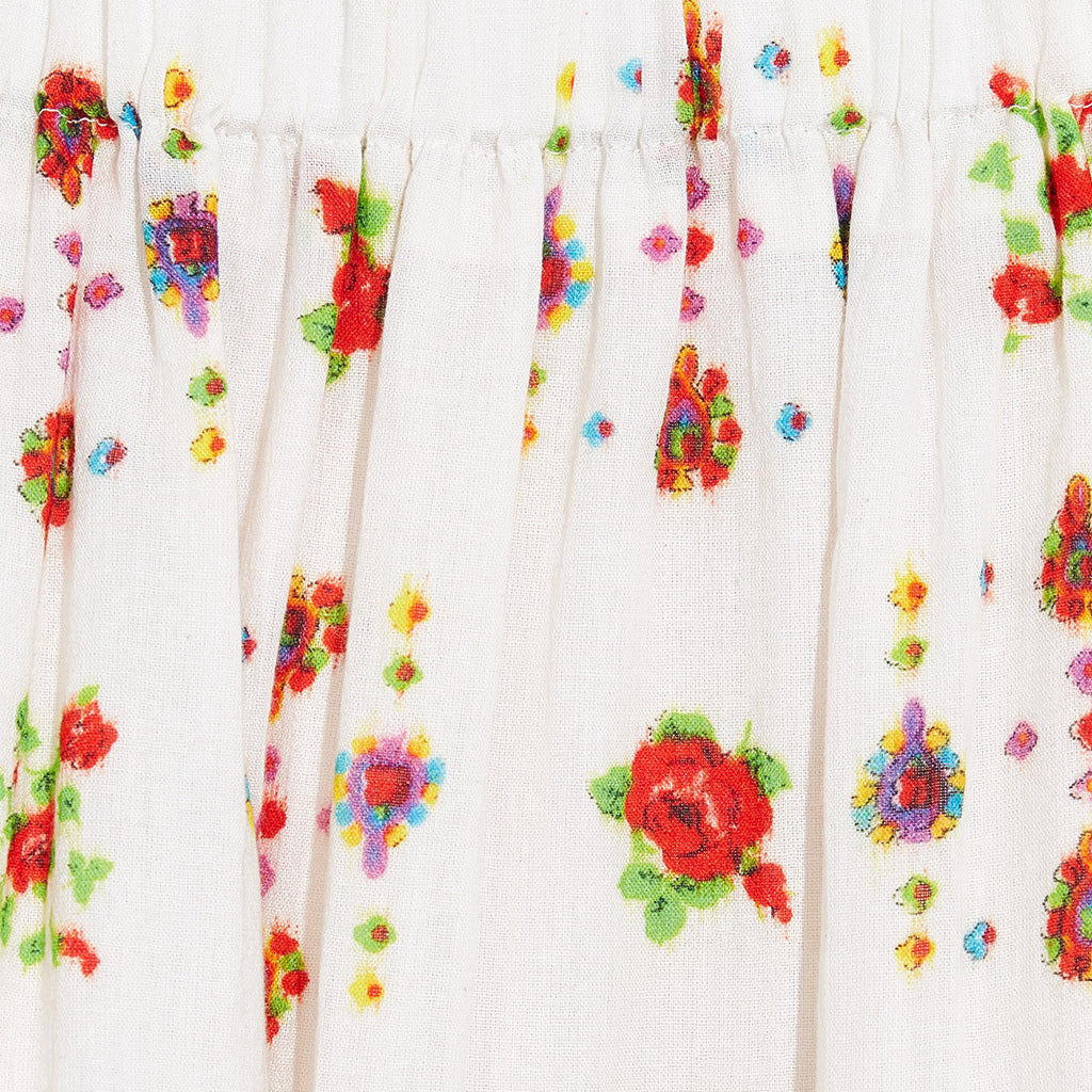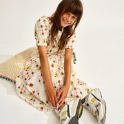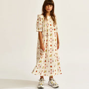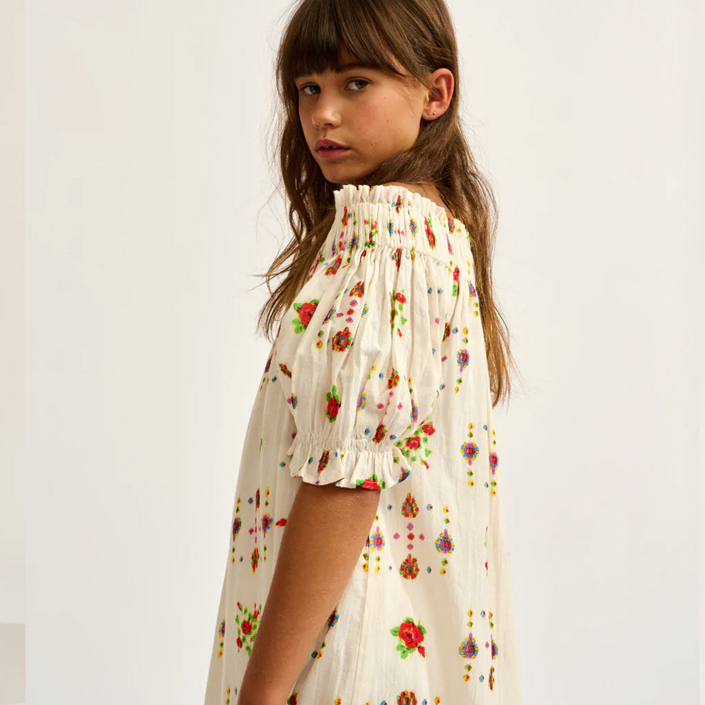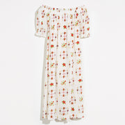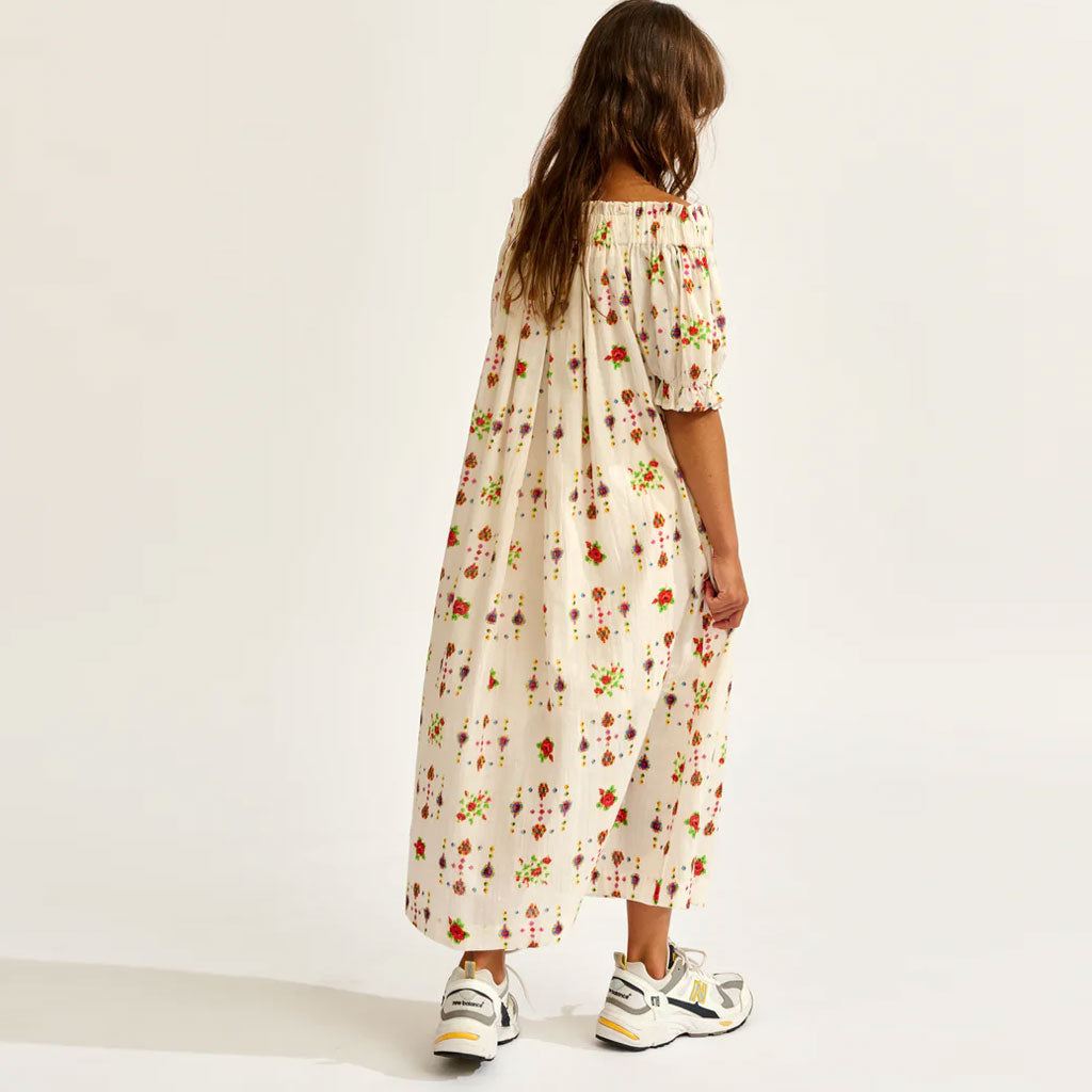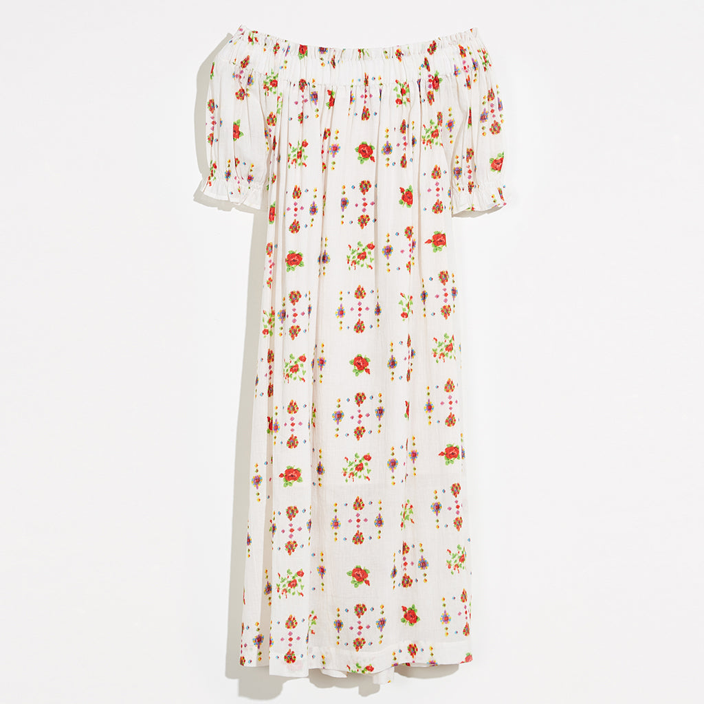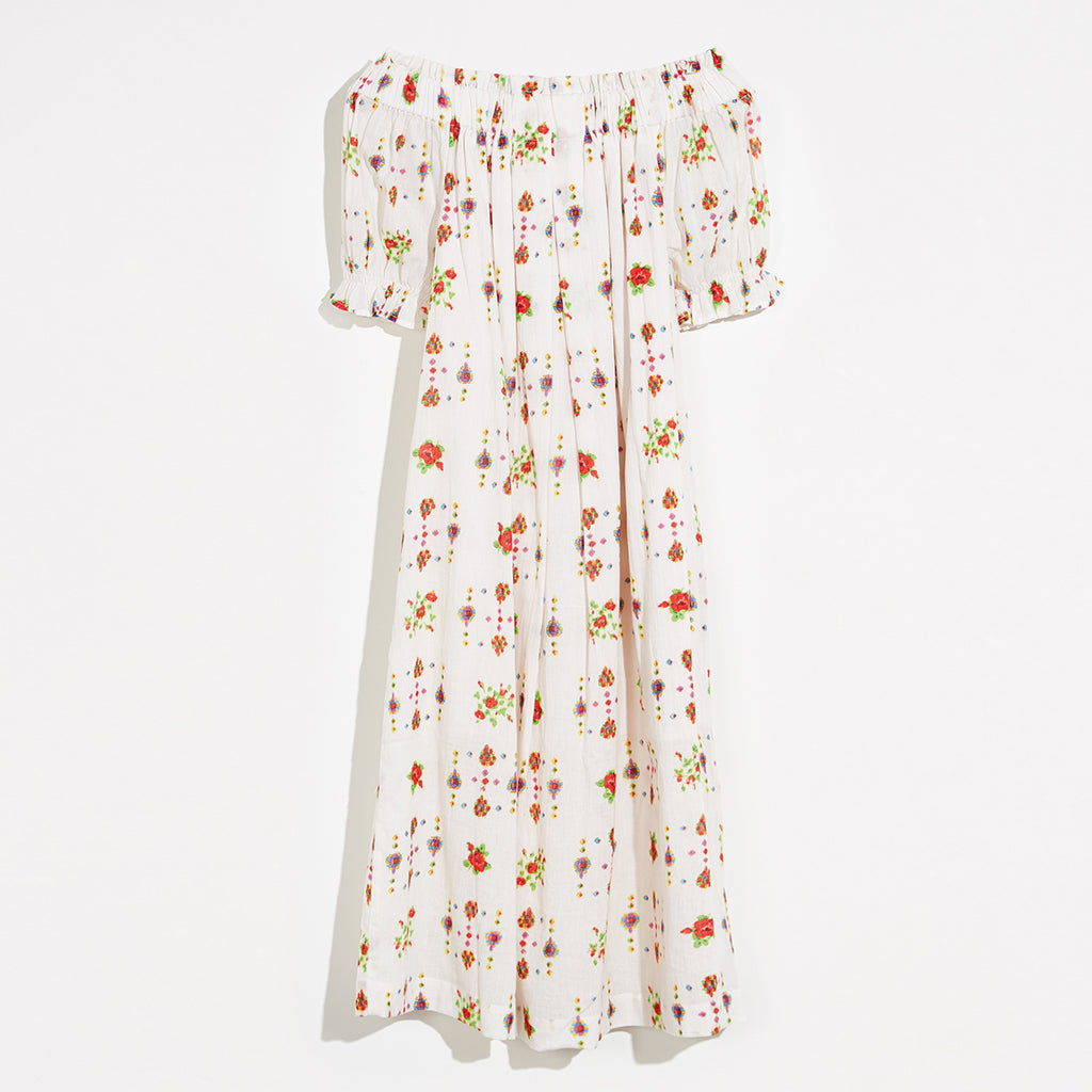 Die hispanischen Einflüsse dieser Kollektion sind unübersehbar, wenn man Henna betrachtet. Dieses lange Kleid hat ein elegantes Off-Shoulder-Design mit Puffärmeln und einem frei fliessenden Rock. Es ist aus leichter Baumwollpopeline gefertigt und spielt auf den Vintage-Stil an, ohne dabei zu übertreiben. Ein absoluter Hingucker.