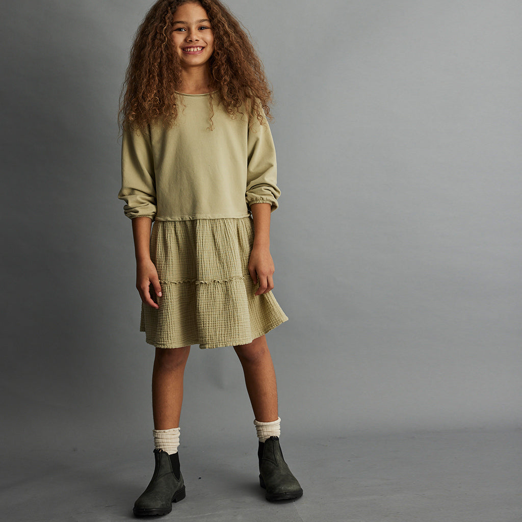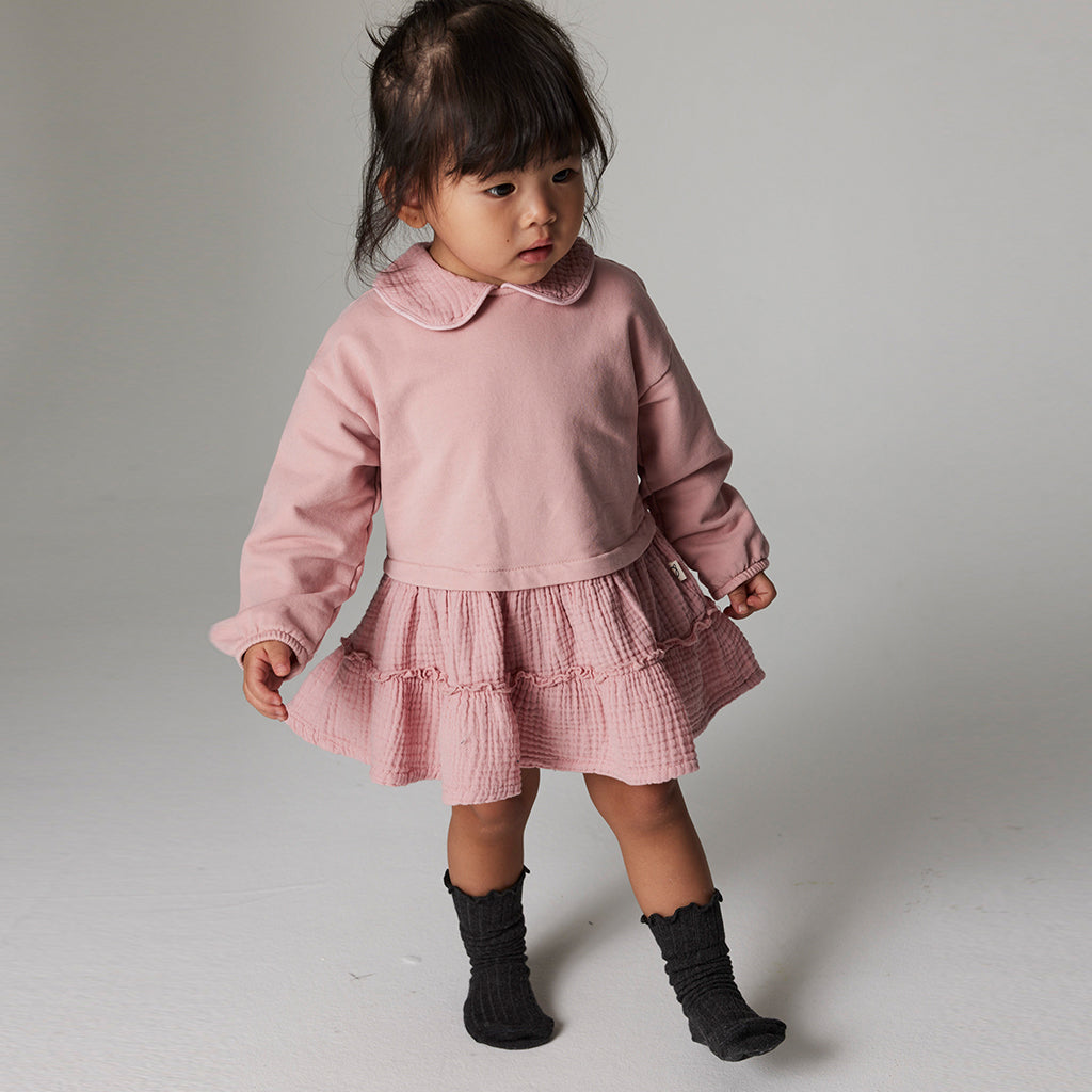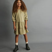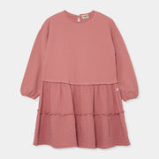 Superweiches Kleid aus Fleece mit langen Ballonärmeln, einem stufenförmigen Rock aus strukturiertem Stoff. Das Kleid hat eine ultraglatte Oberfläche und eine gebürstete Innenseite für eine besonders warme Textur.