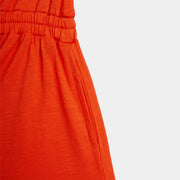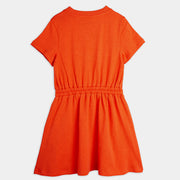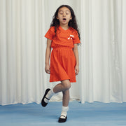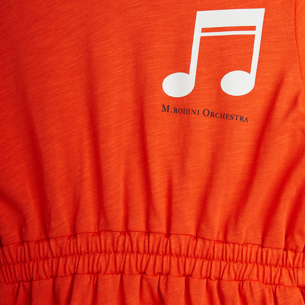 Ein Kleid mit Signalwirkung: knallrotes Sommerkleid mit weisser Musiknote.