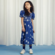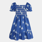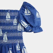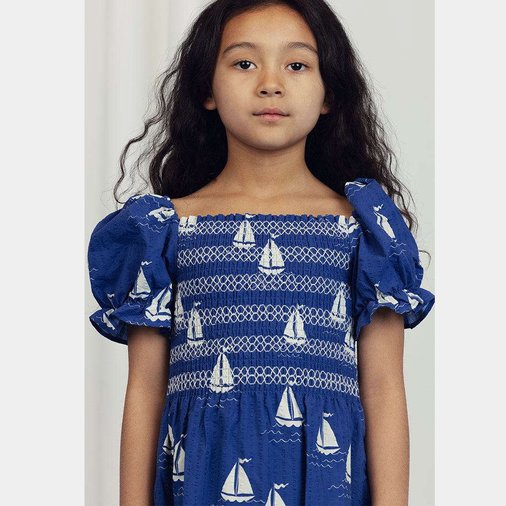 Verspieltes Sommerkleid von Mini Rodini mit kleinen, weissen Schiffen. Hergestellt aus 100% GOTS-zertifizierter Bio-Baumwolle.