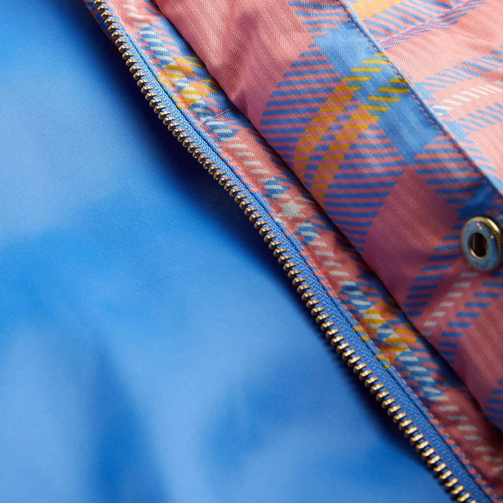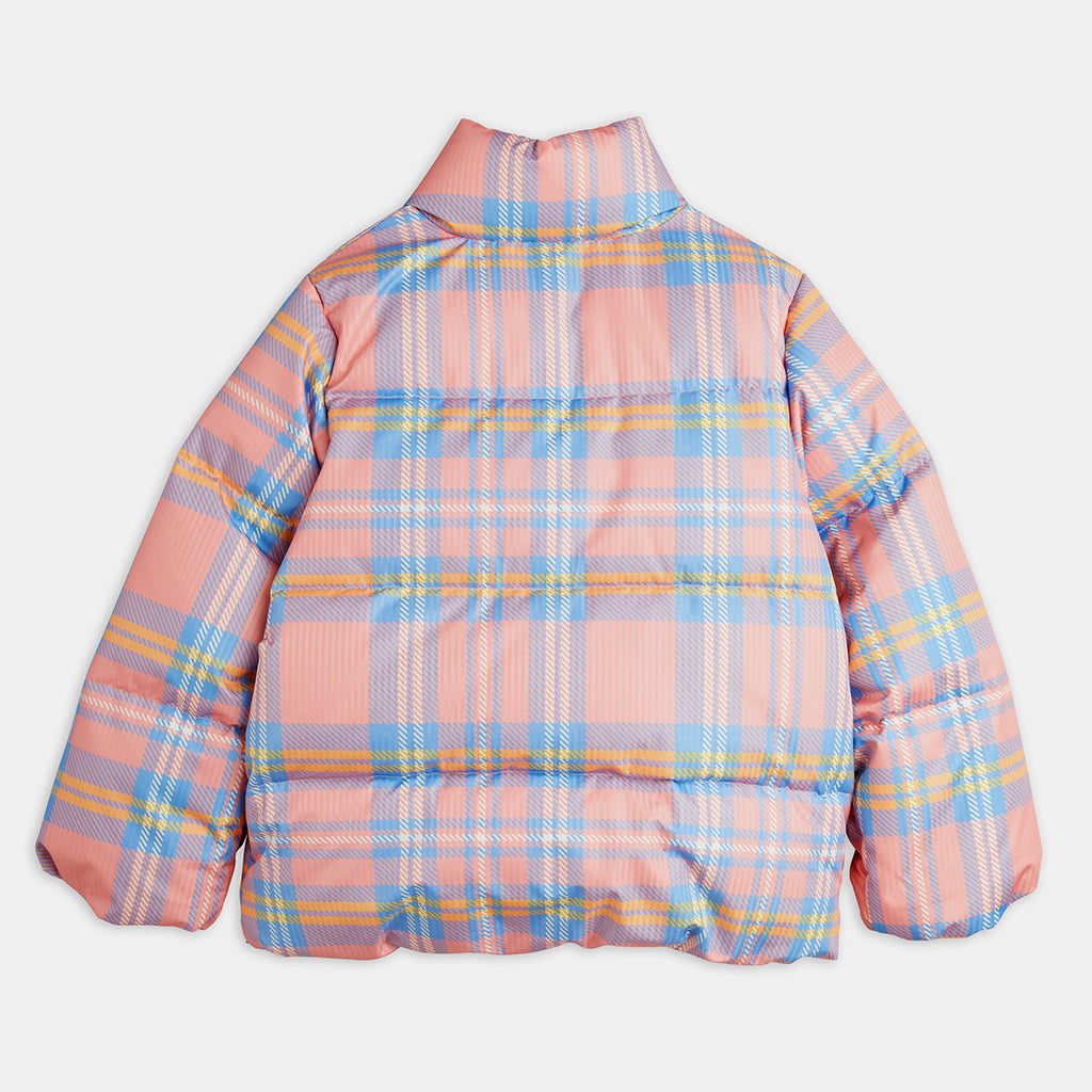 Warme, rosafarbene Pufferjacke mit blauem Karomuster und goldenen Druckknöpfen.