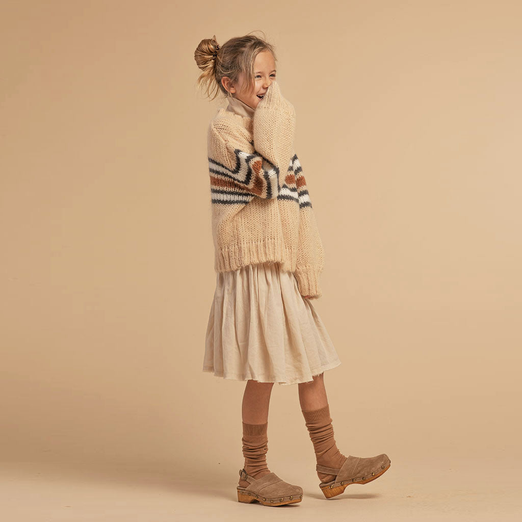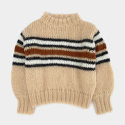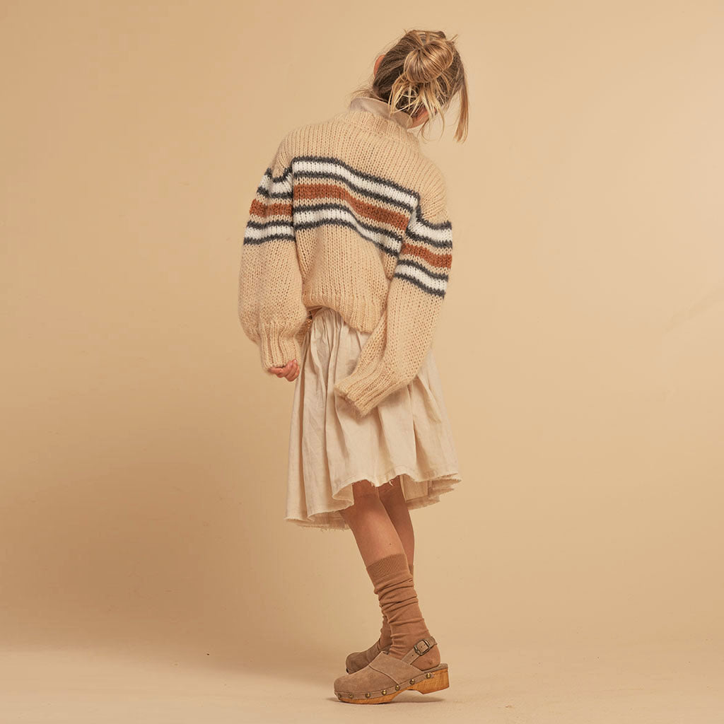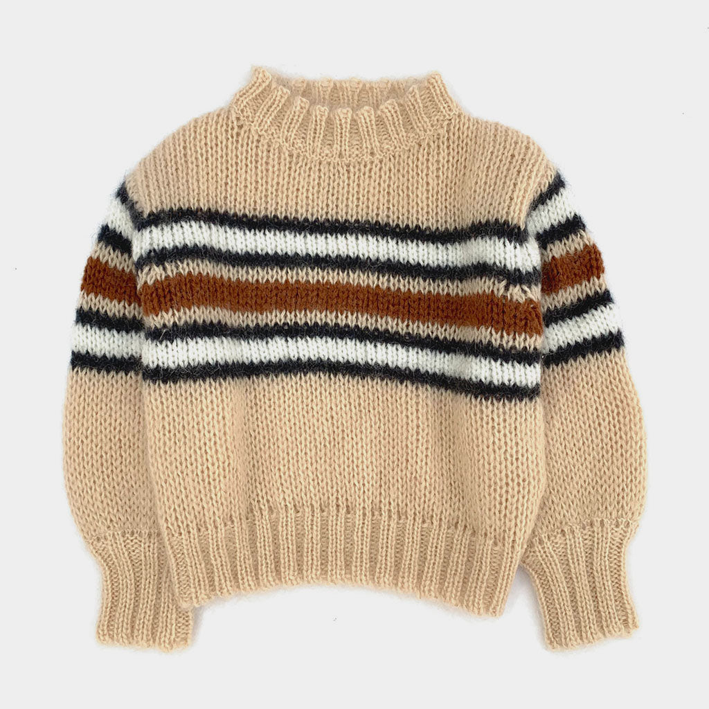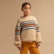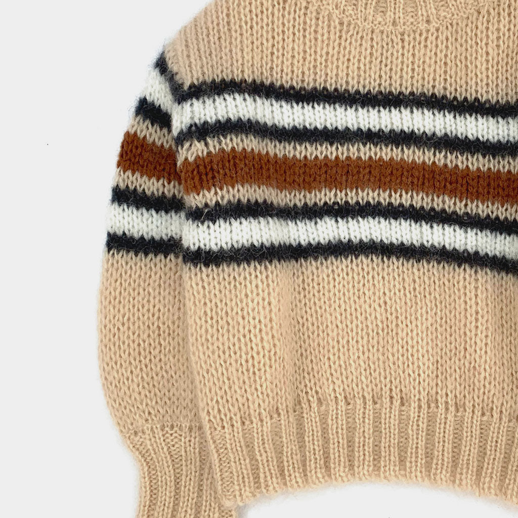 Naturfarbener, gestreifter Strickpullover aus zartester Mohair- und Merinowolle.