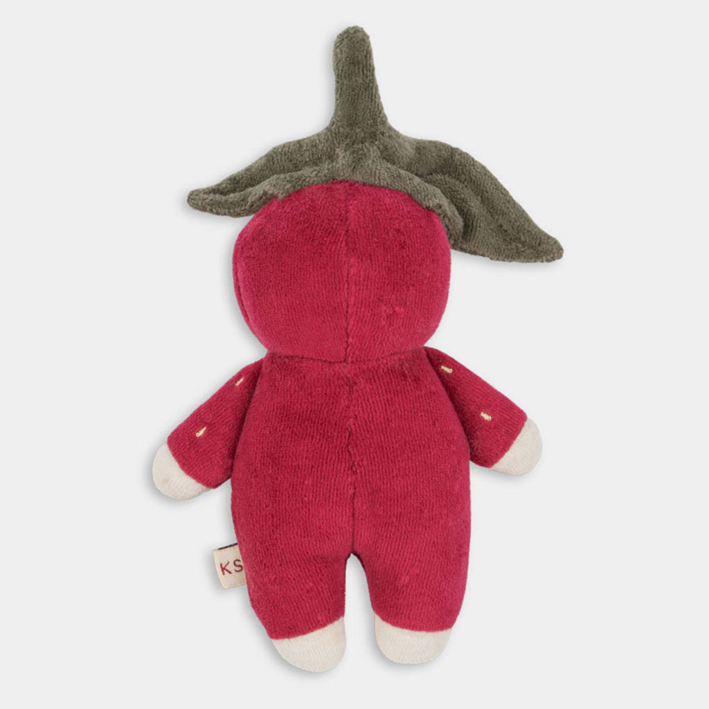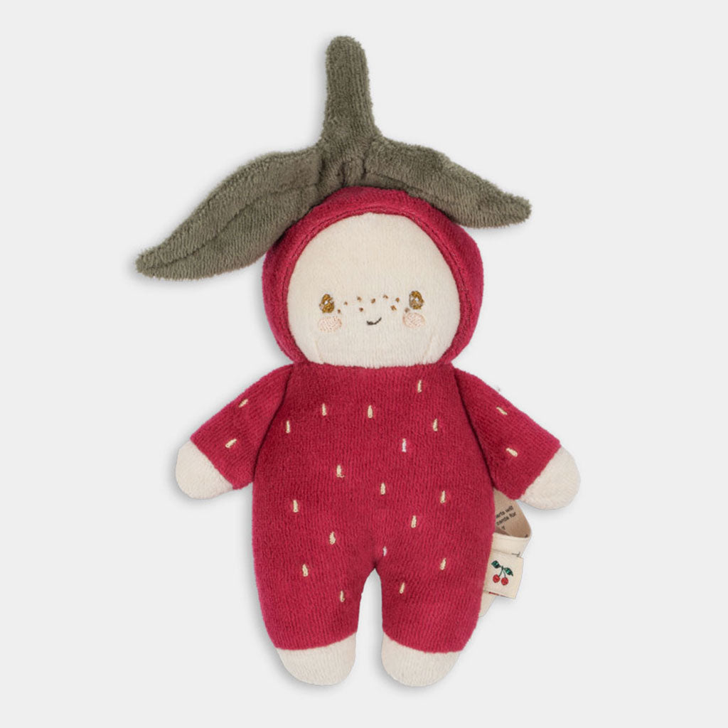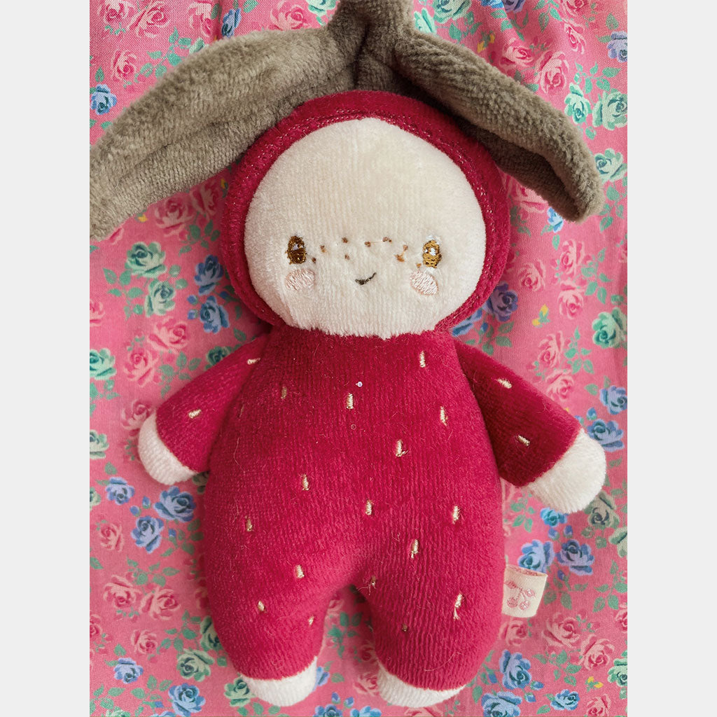 Weiches Erdbeer-Mini-Püppchen für kleine Hände zum Greifen und Spielen.