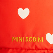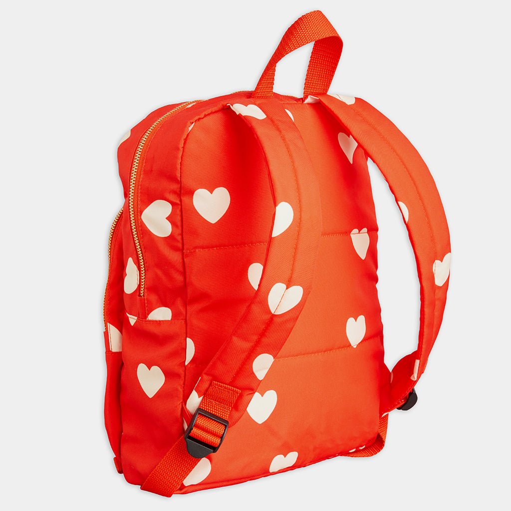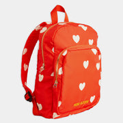 Was für ein Hingucker: der knallrote Rucksack mit weissen Herzen.