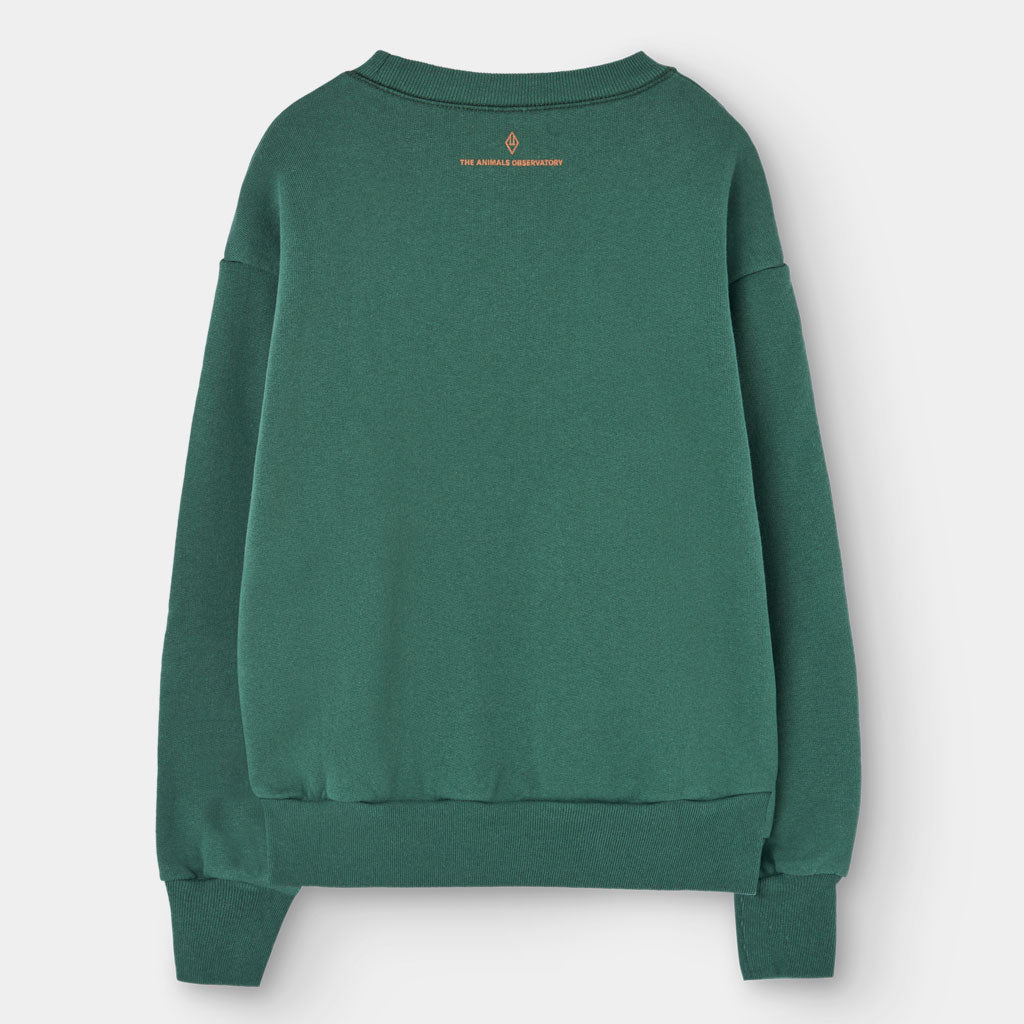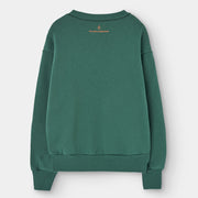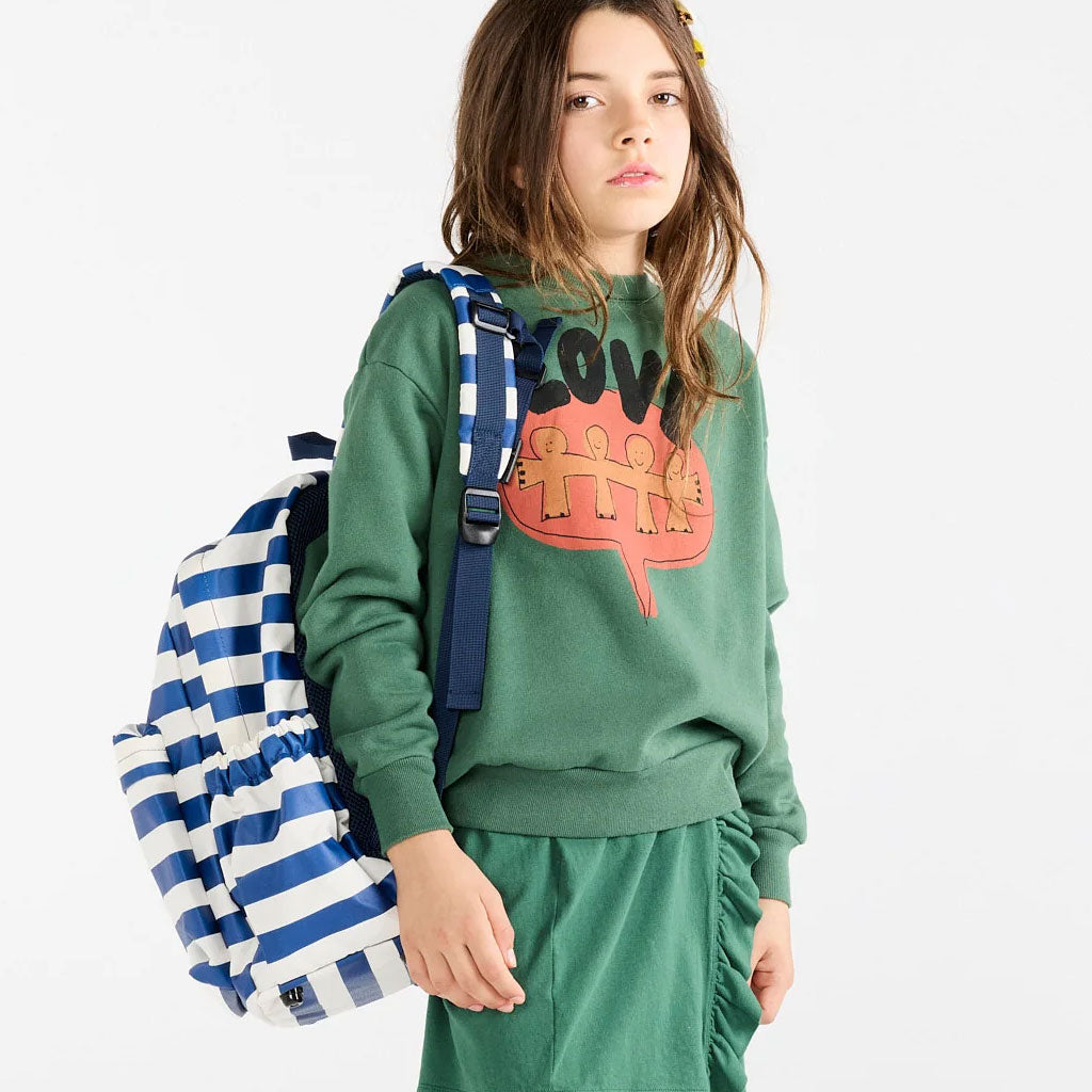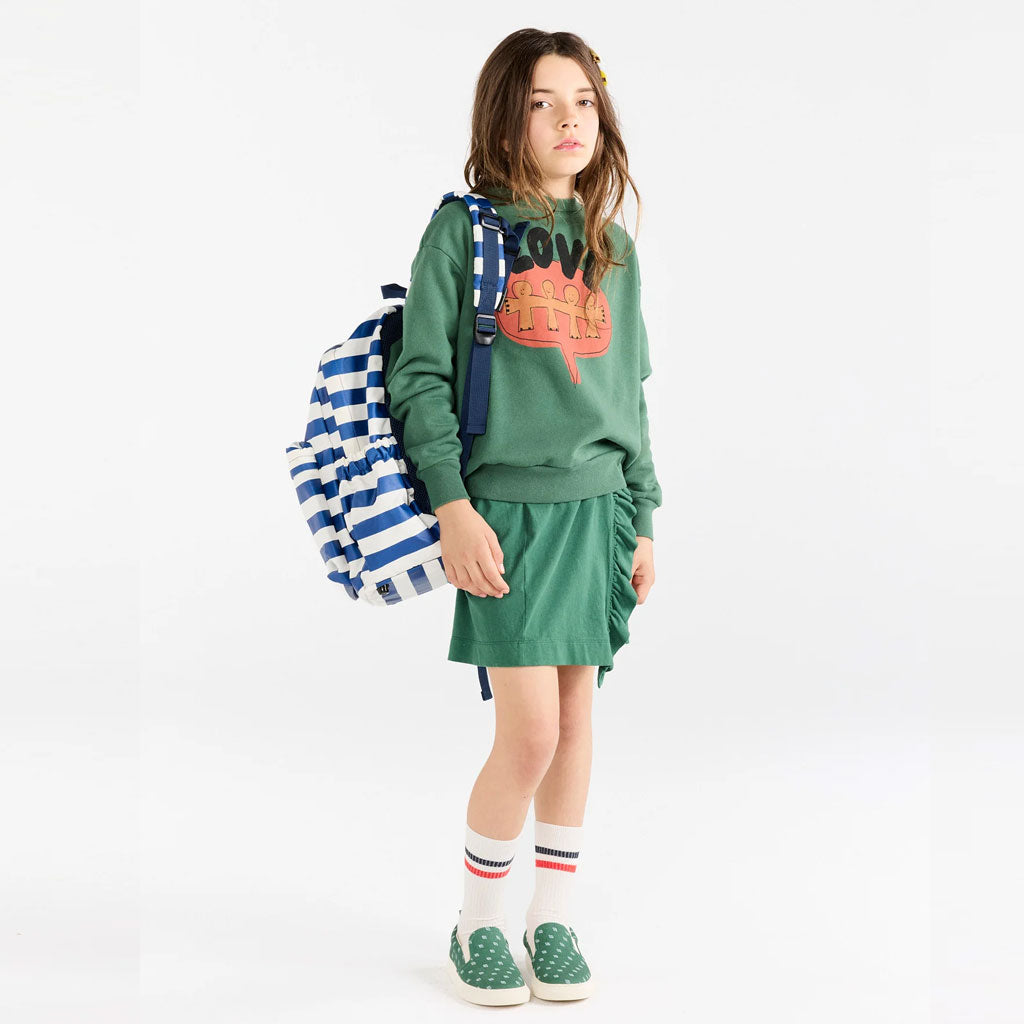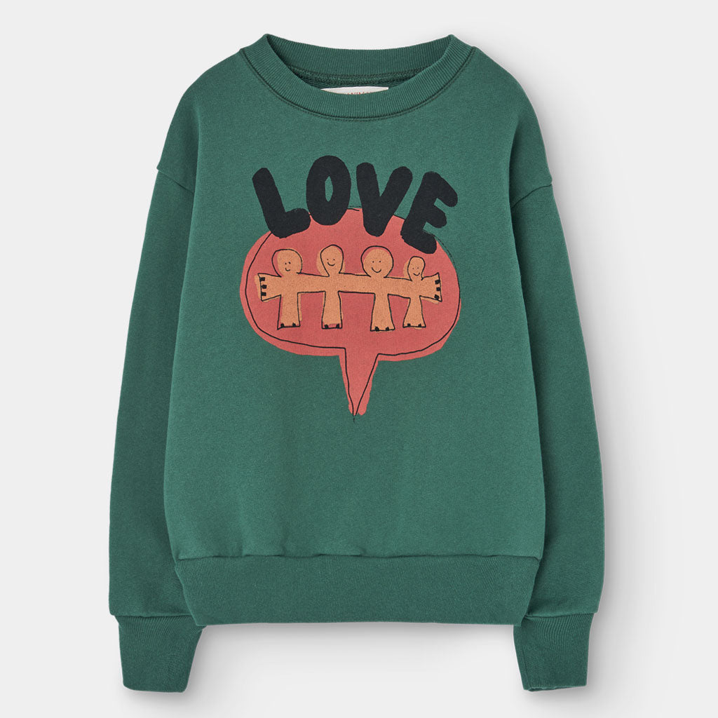 Die auffällige LOVE-Botschaft und die Figuren leuchten auf tiefem Grün und feiern die Einheit durch Kinderkleidung mit Herz.
