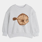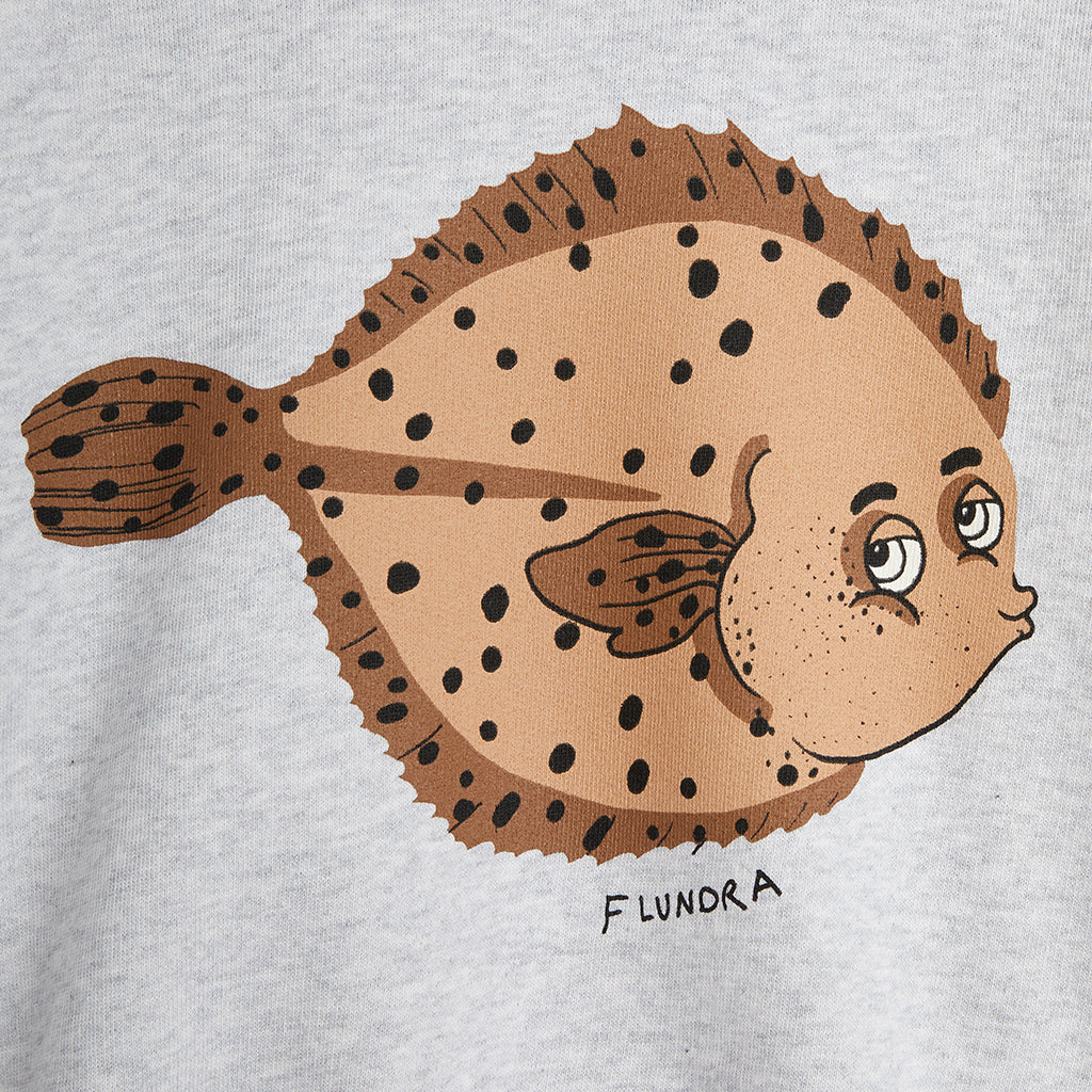 Grau-meliertes Mini Rodini Sweatshirt mit einem grossen Flunder Fisch, hergestellt aus 100% GOTS-zertifizierter Bio-Baumwolle. Das Sweatshirt hat eine weiche, gebürstete Innenseite und leicht überschnittene Schultern für eine entspannte Passform sowie Rippbündchen am Hals, an den Ärmelenden und am unteren Saum.