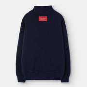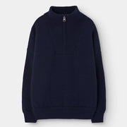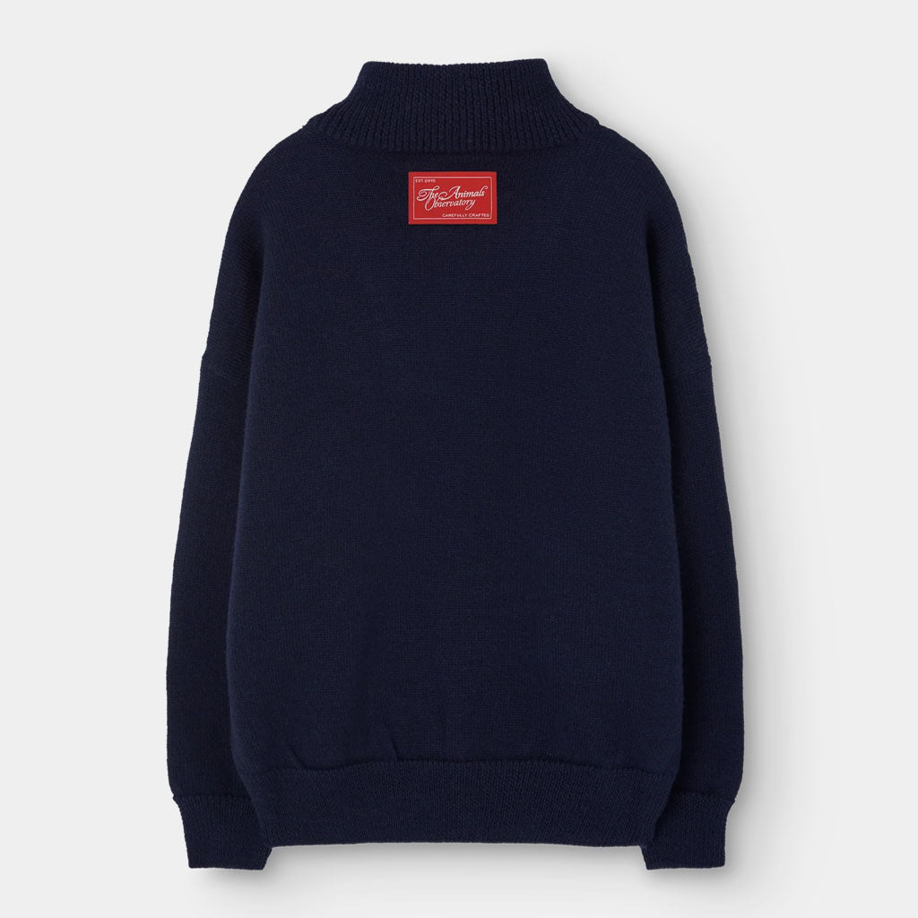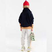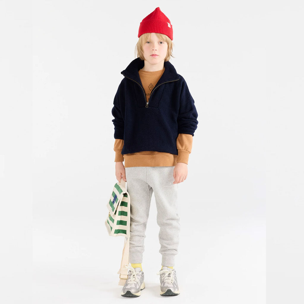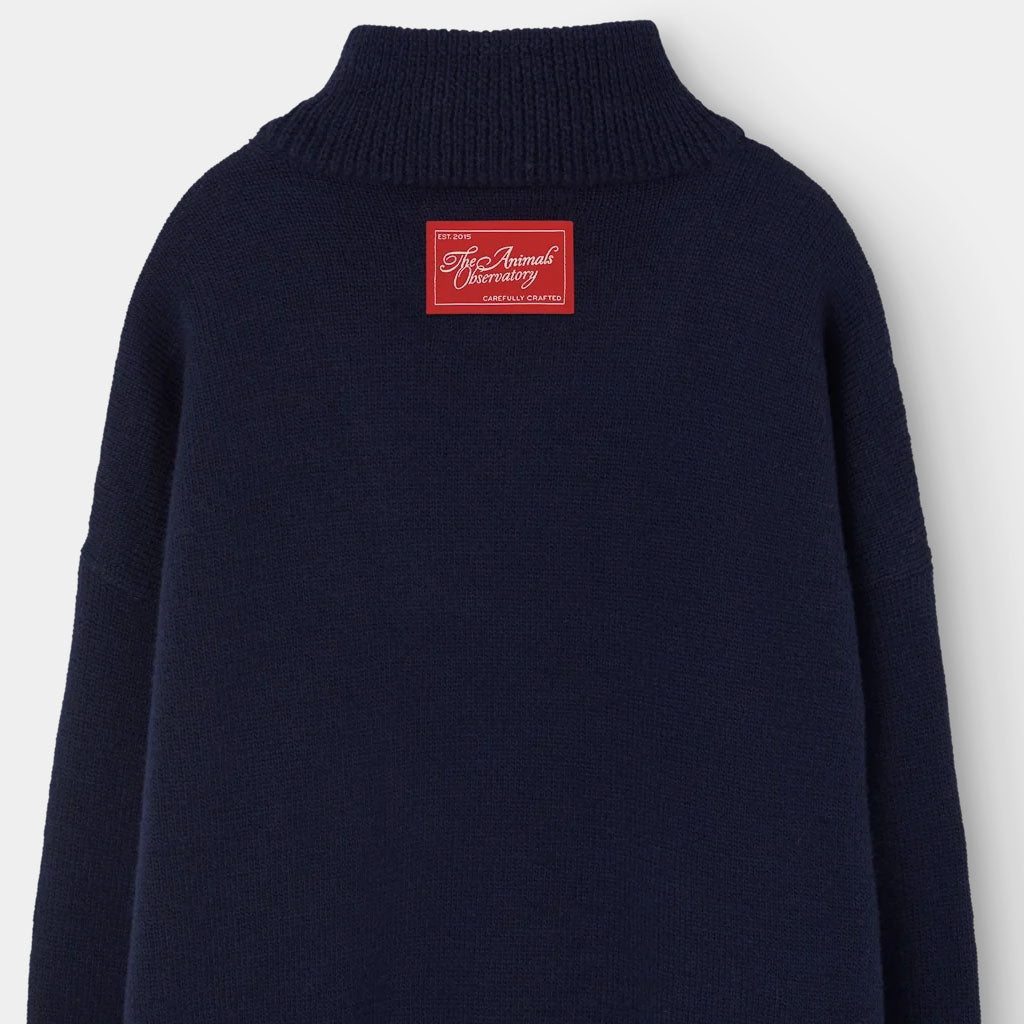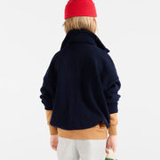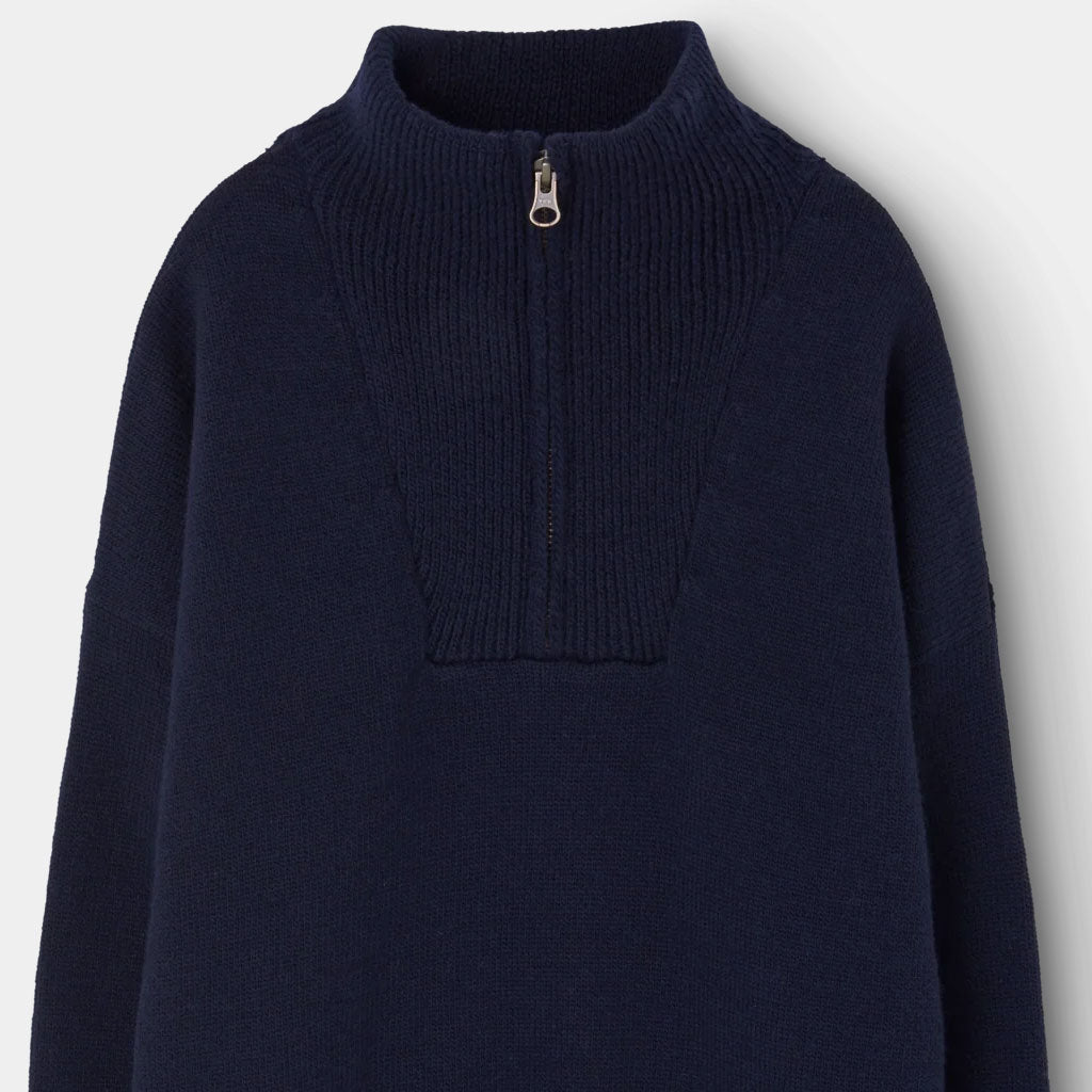 Dieser marineblaue Strickpullover aus zartester Merino Wolle mit halbem Reissverschluss vereint Eleganz und Wärme und fängt die Essenz der TAO Herbst-/Wintermode 2025 für kleine Entdecker ein.