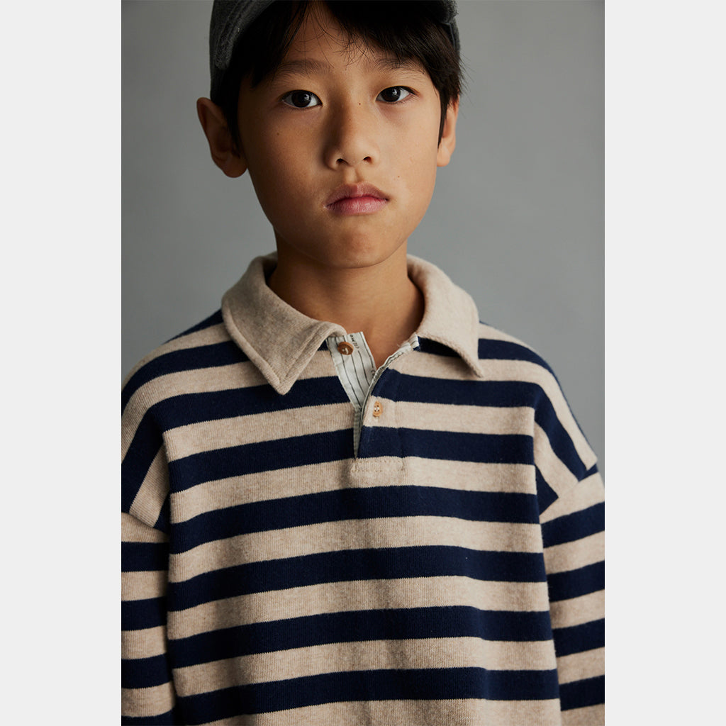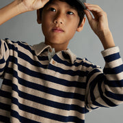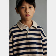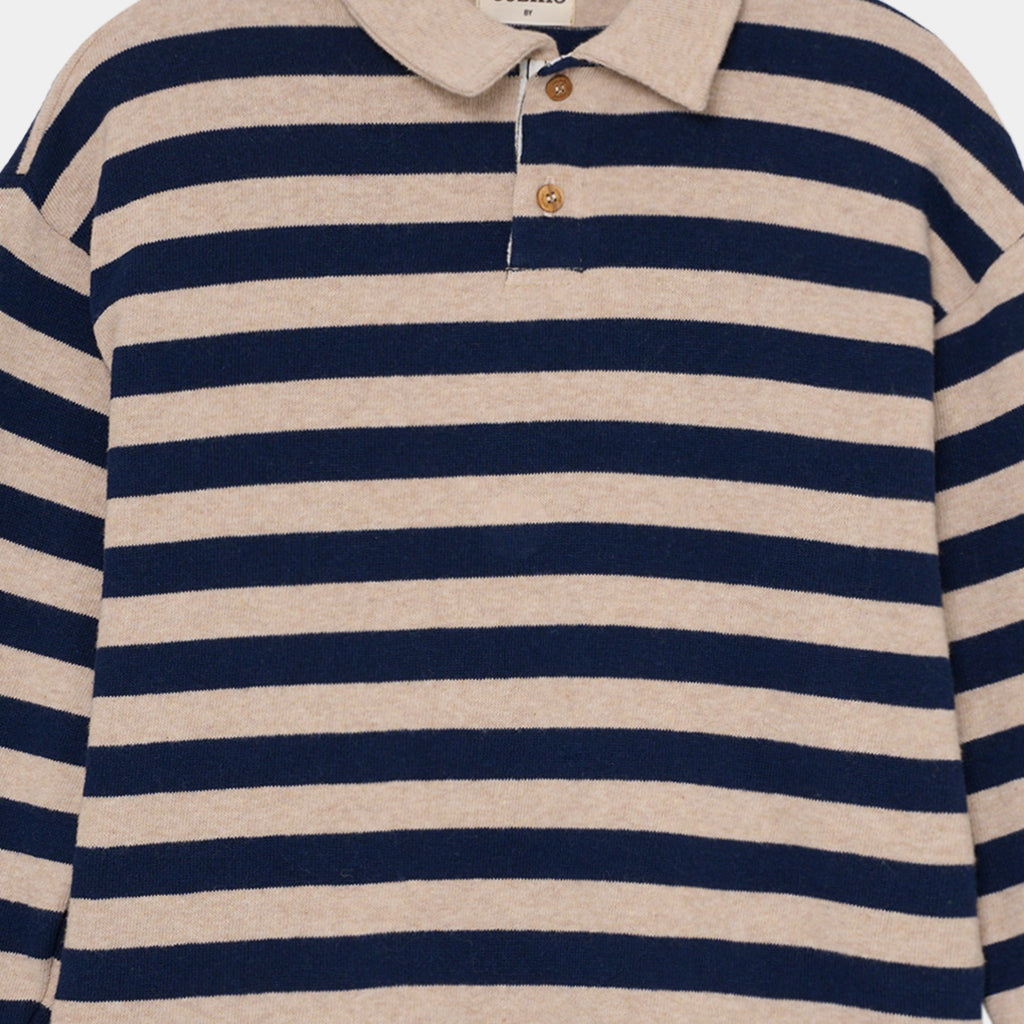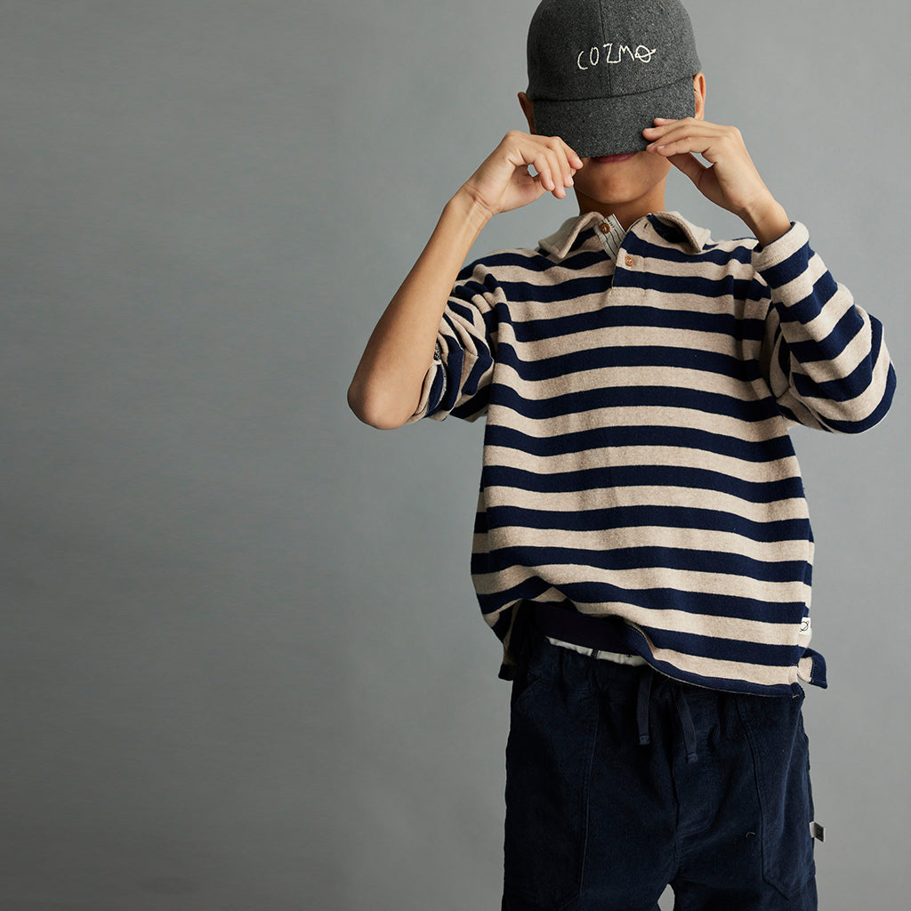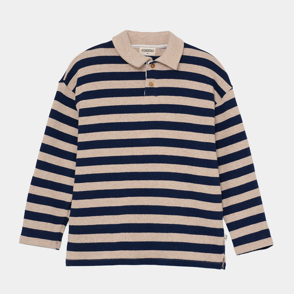 Wir wiederholen uns, aber die Kleider von My Little Cozmo sind extra zart und soft. So auch dieses breit gestreifte Sweatshirt mit Polokragen.