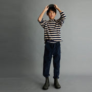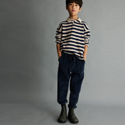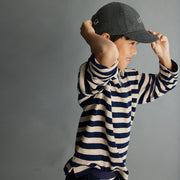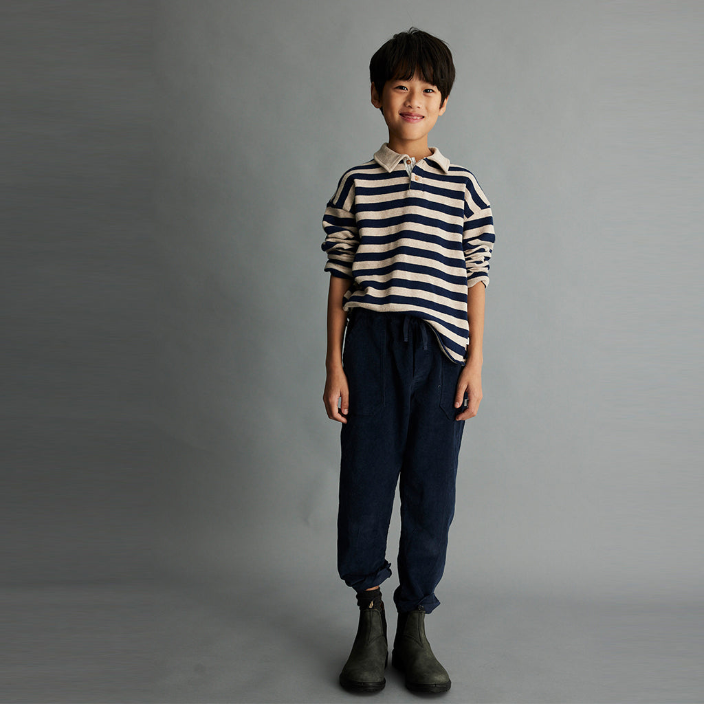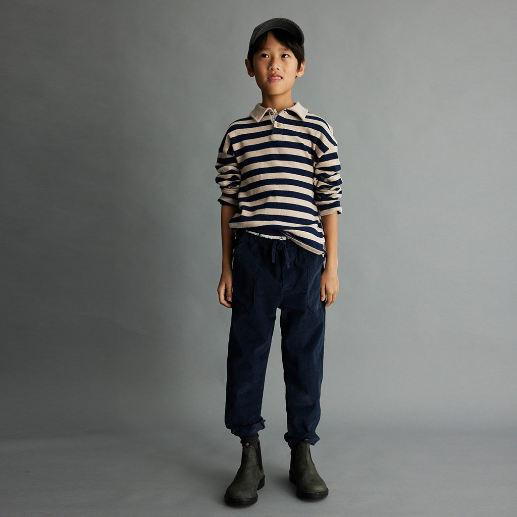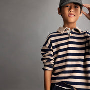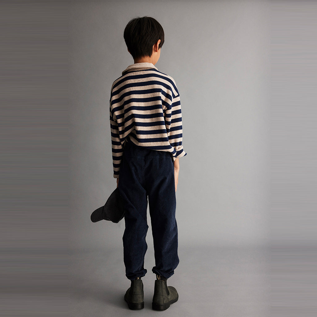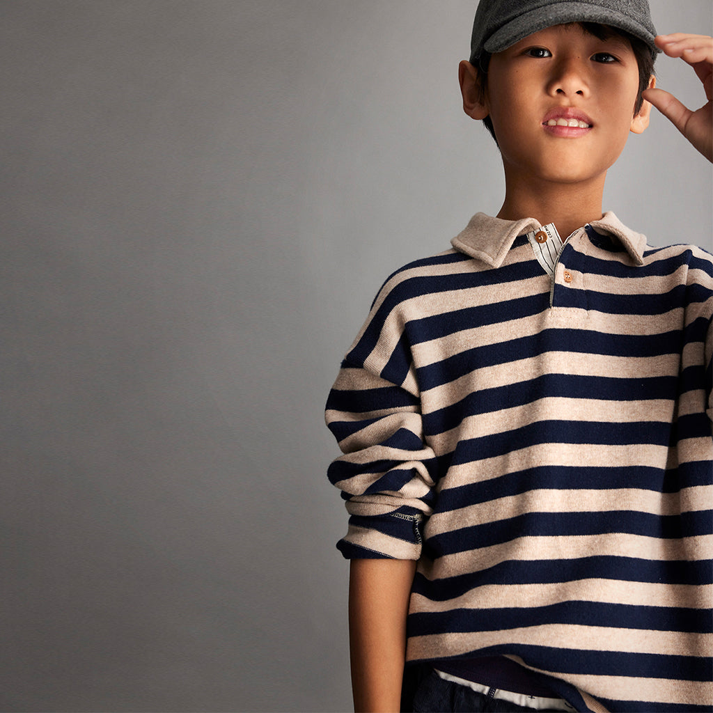 Wir wiederholen uns, aber die Kleider von My Little Cozmo sind extra zart und soft. So auch dieses breit gestreifte Sweatshirt mit Polokragen.
