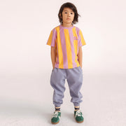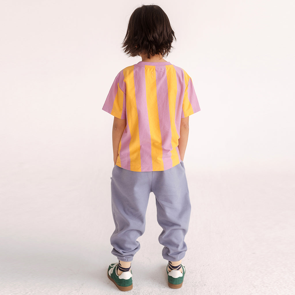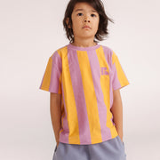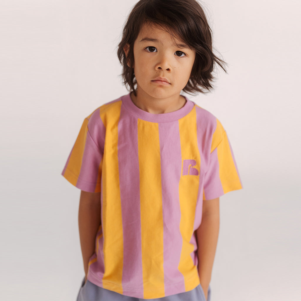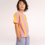Weit geschnittenes T-Shirt mit breiten gelb-rosafarbenen Streifen.