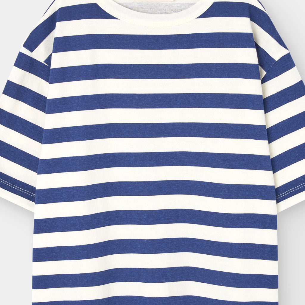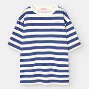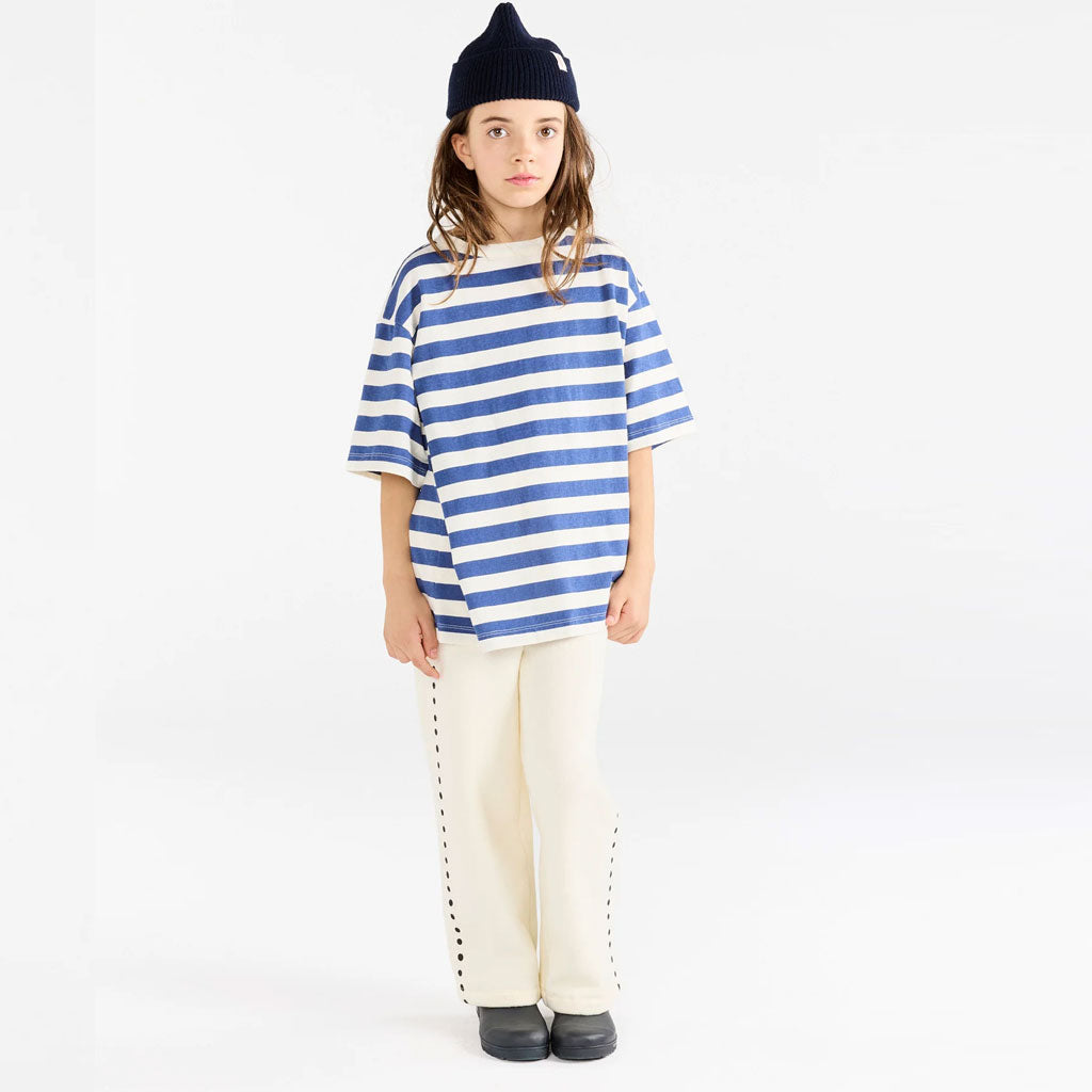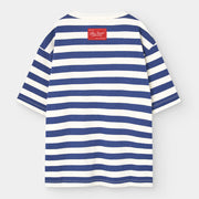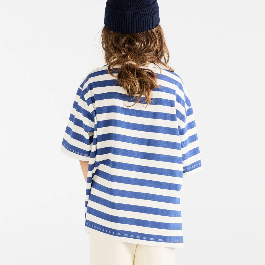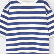 Dieses maritim inspirierte Oversize T-Shirt kombiniert zeitlose marineblaue Streifen mit einem auffälligen roten Logo-Aufnäher auf der Rückseite – eine frische Interpretation der Herbst-/Wintertrends 2025 für Kinderalltagskleidung.