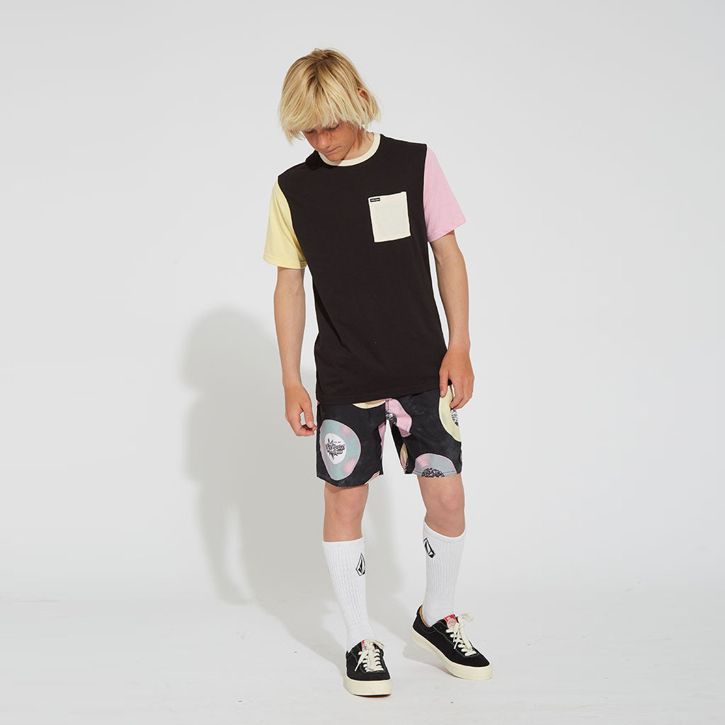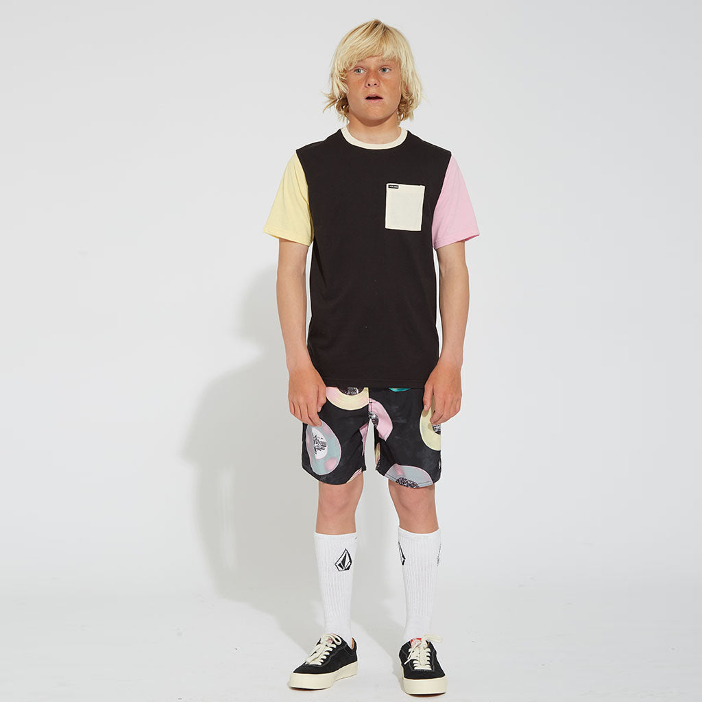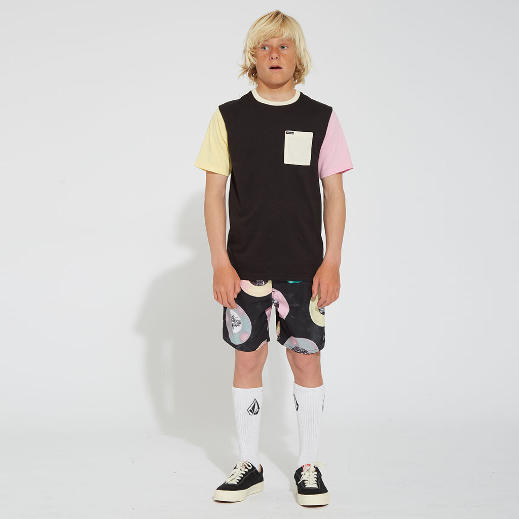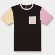 Schwarzes T-Shirt mit gelbem und rosafarbenem Ärmel, cremefarbenem Bündchen und Brusttasche.
