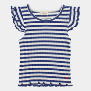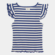 Blau-weiss gestreiftes T-Shirt mit Rüschen am Armausschnitt.