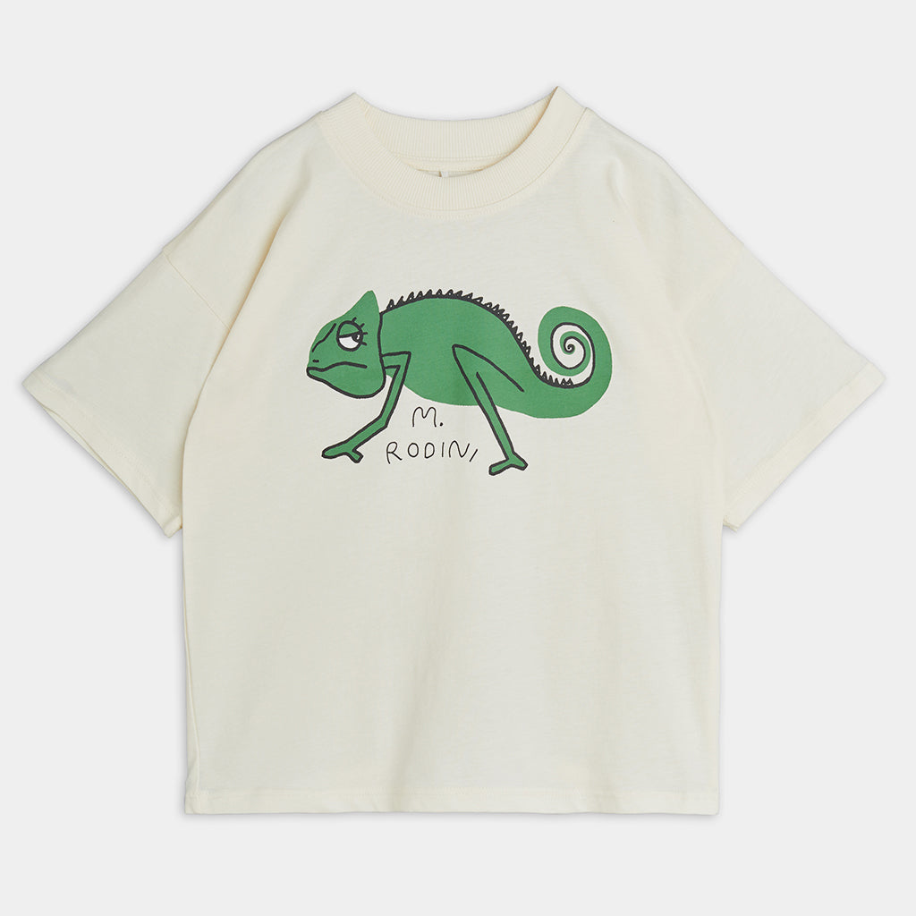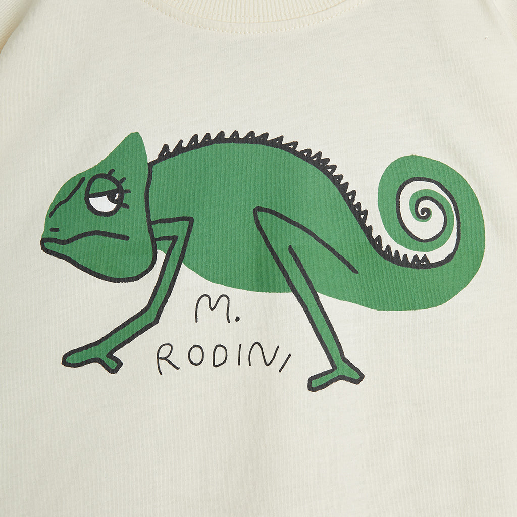 Weisses Mini Rodini T-Shirt mit grüner Echse, hergestellt aus 100% GOTS-zertifizierter Bio-Baumwolle.