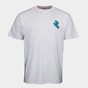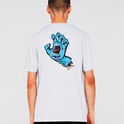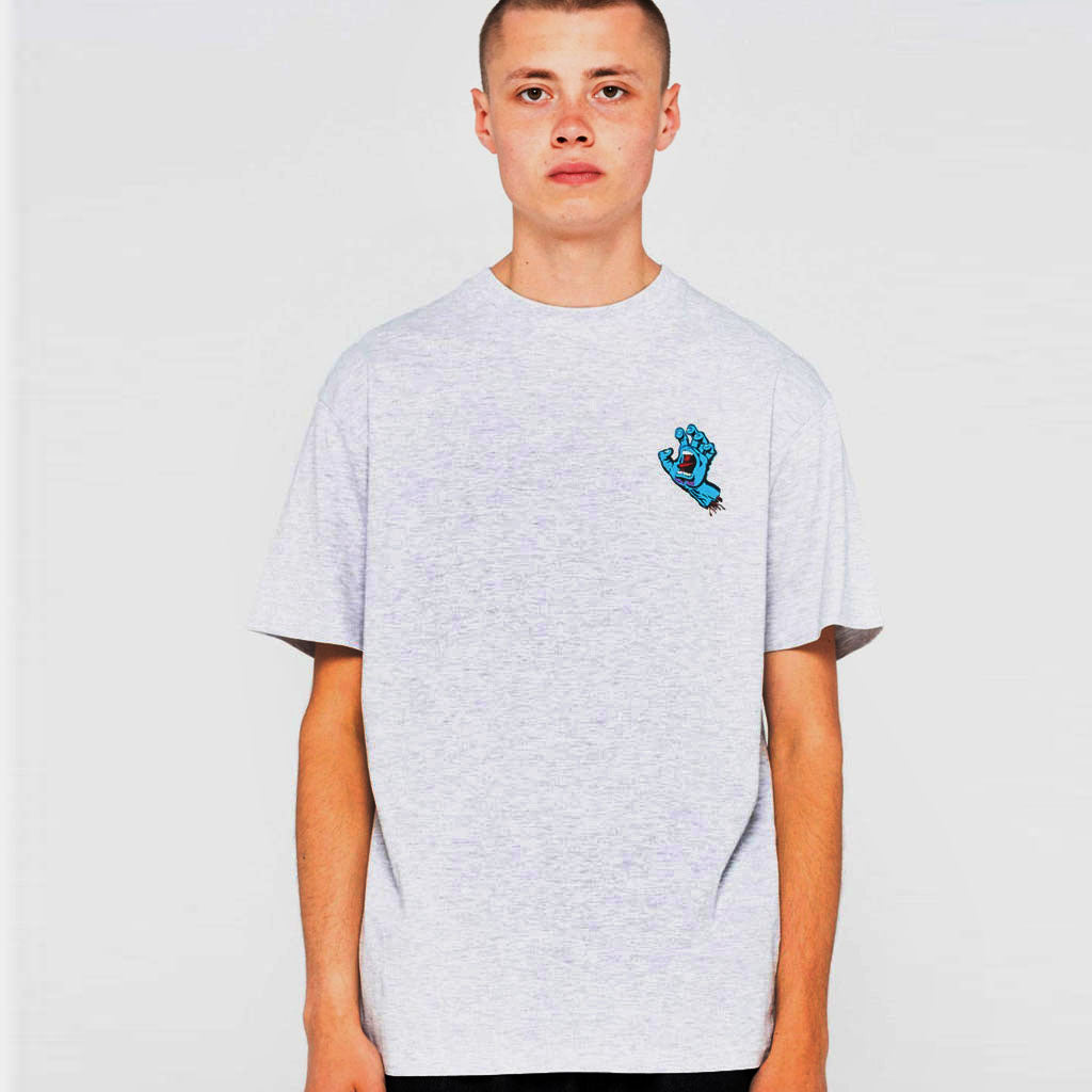 Grau-meliertes T-Shirt mit kleiner Screaming Hand auf der Brust und einer grossen Hand am Rücken.