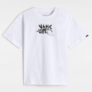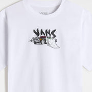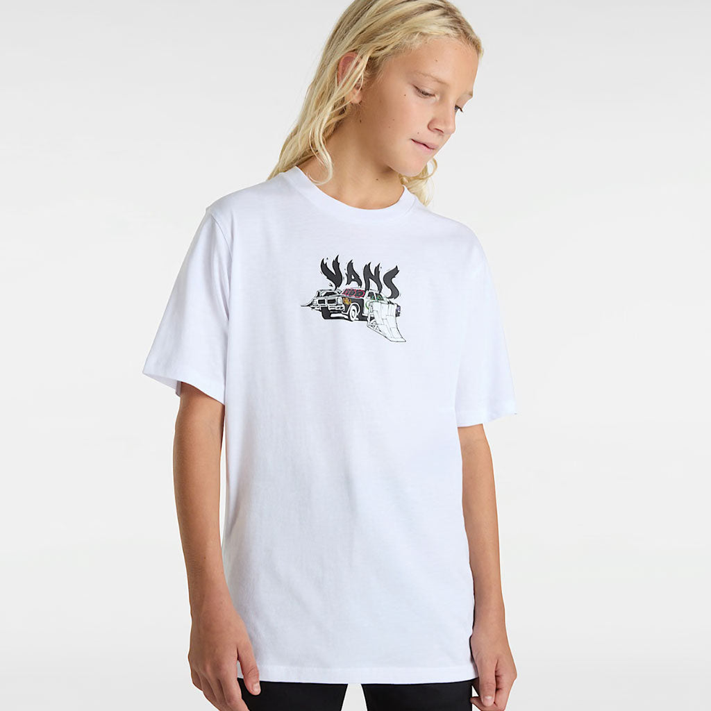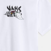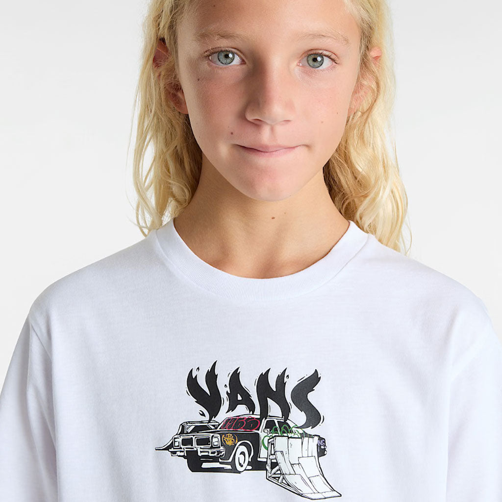 Weisses Vans T-Shirt mit Polizeiauto und Rampen-Illustration.