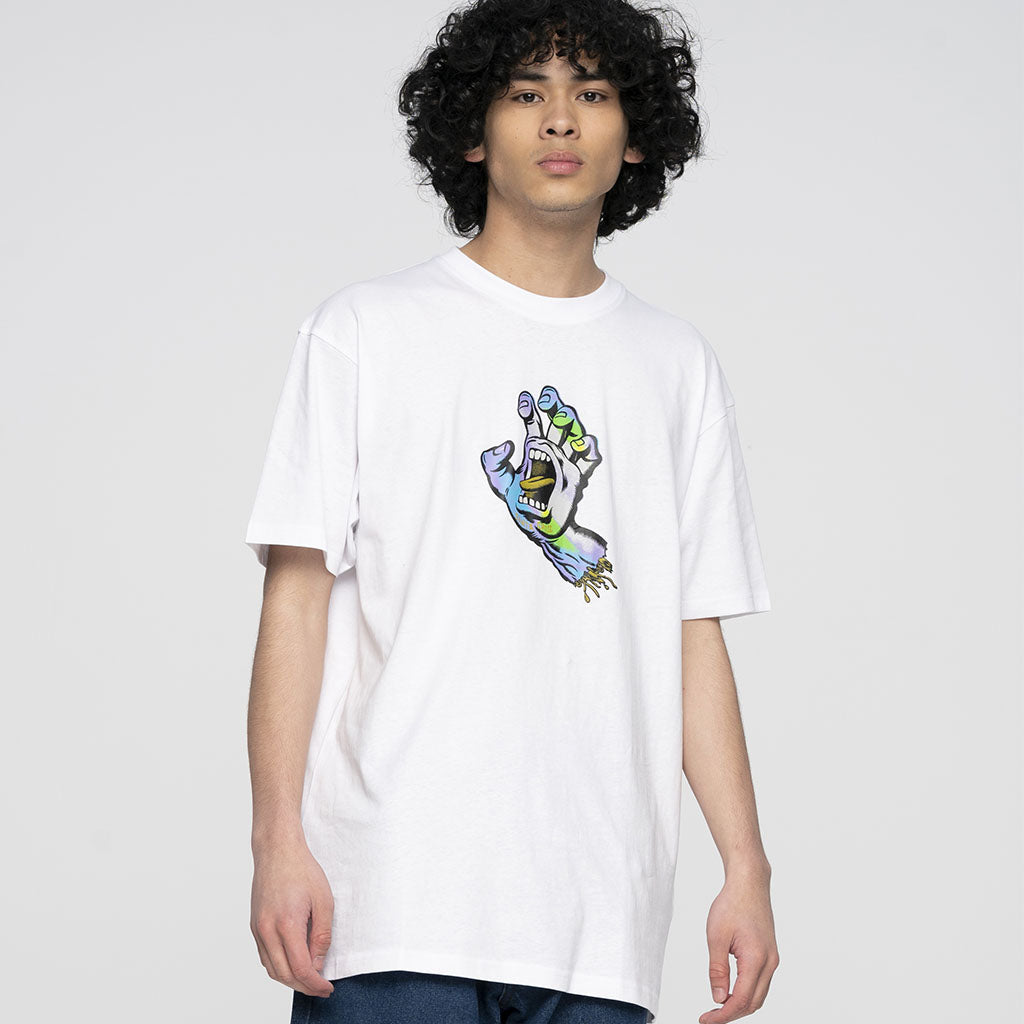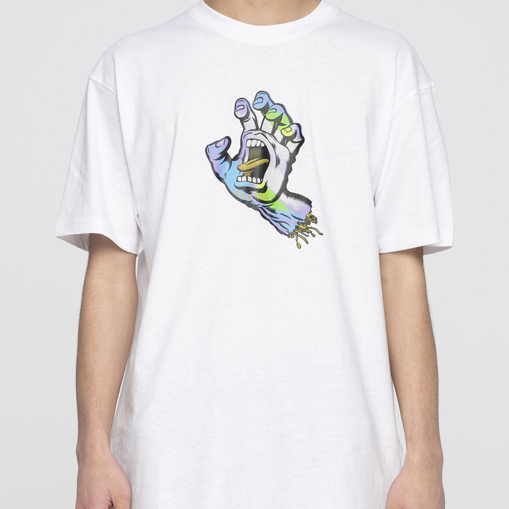 Weisses T-Shirt in Erwachsenengrössen mit Holo Screaming Hand von Santa Cruz.