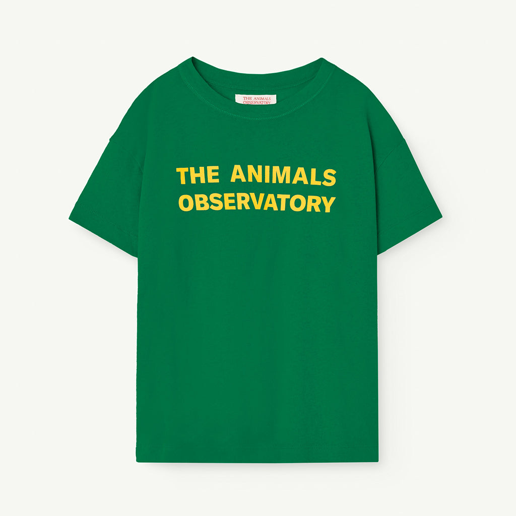Grünes T-Shirt mit gelbem The Animals Observatory Schriftzug.