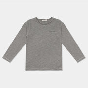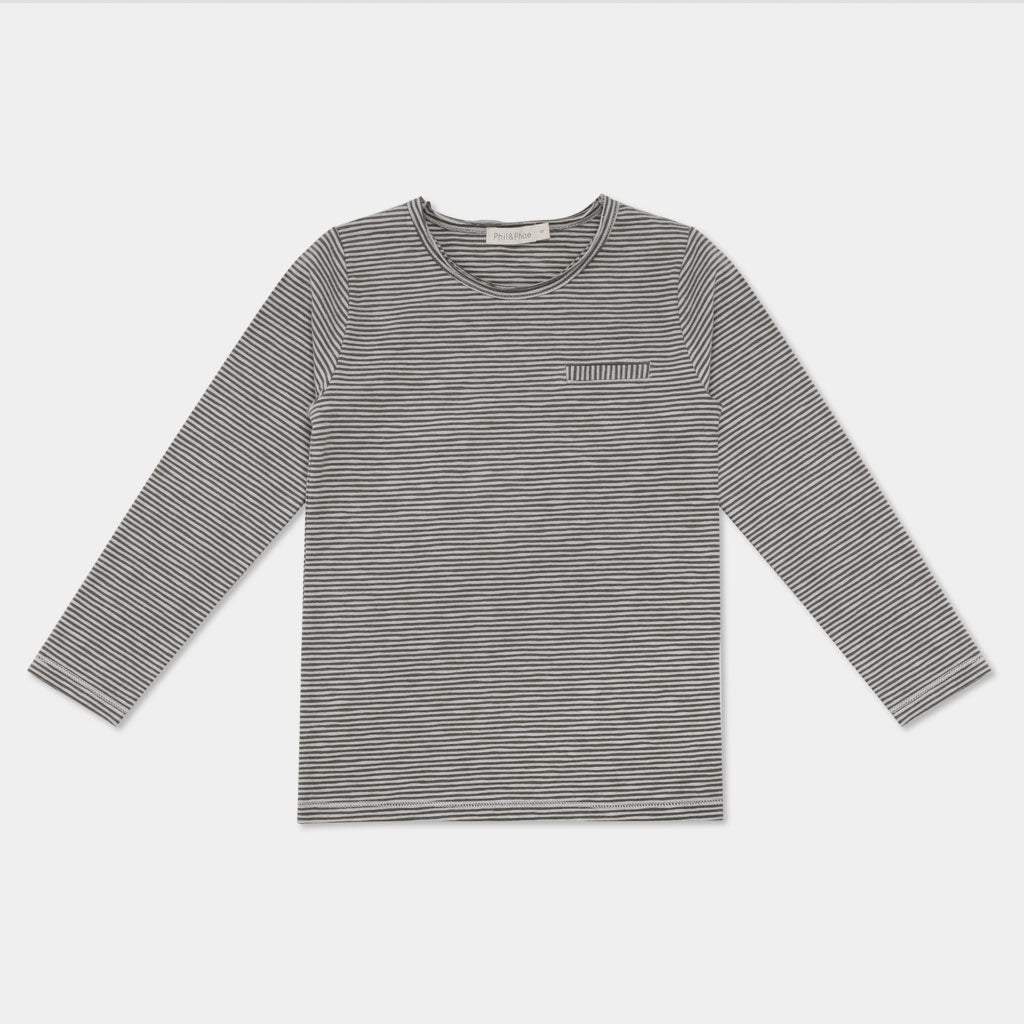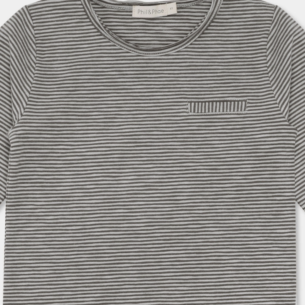 Schlichtes T-Shirt mit feinen Streifen und falscher Brusttasche. Hergestellt aus zartem Bio-Baumwolljersey mit 5% Elastan für einen angenehmen Stretch. Die Babygrössen (bis 18M) haben einen Druckknopfverschluss an der Schulter für einfaches An- und Ausziehen..
