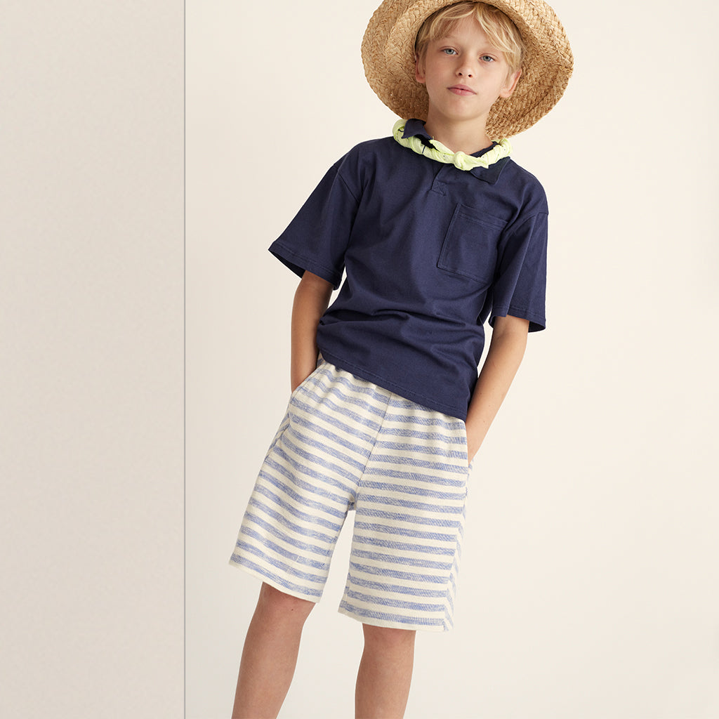 Details: Ungeknöpfter Kragen. Kurze Ärmel. Aufgesetzte Tasche auf der Vorderseite. Gestreifter Kontraststoff an der Innenseite des Kragens.