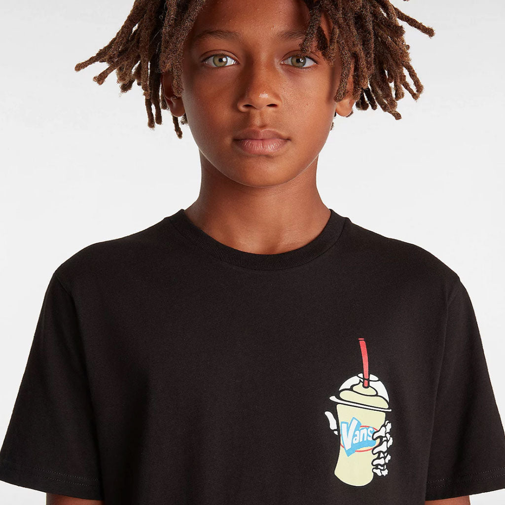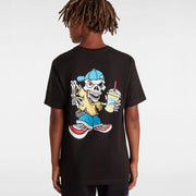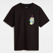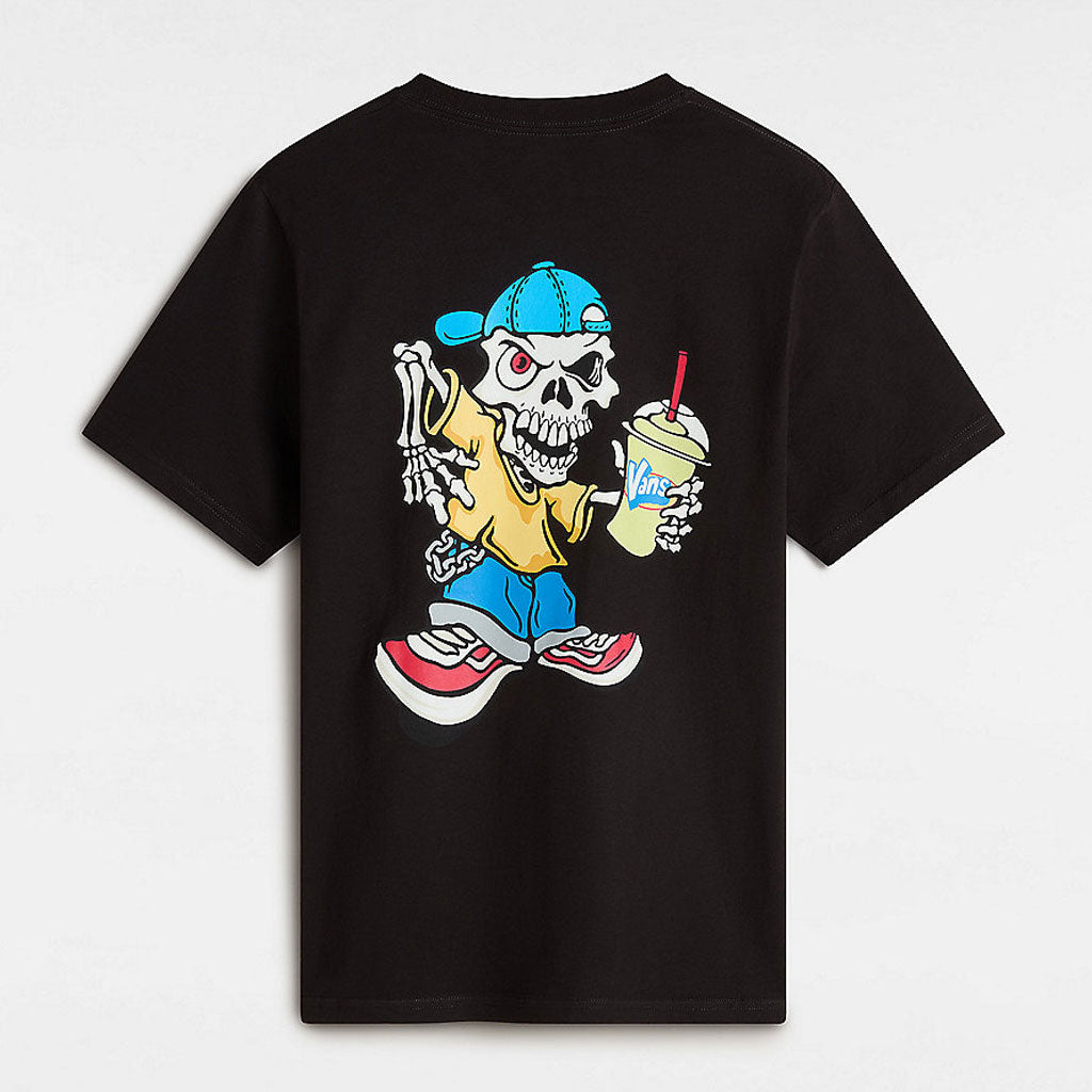 Schwarzes Vans T-Shirt mit Rundhalsausschnitt und coolem Reggie Siebdruckgrafik auf Brust und Rücken.