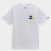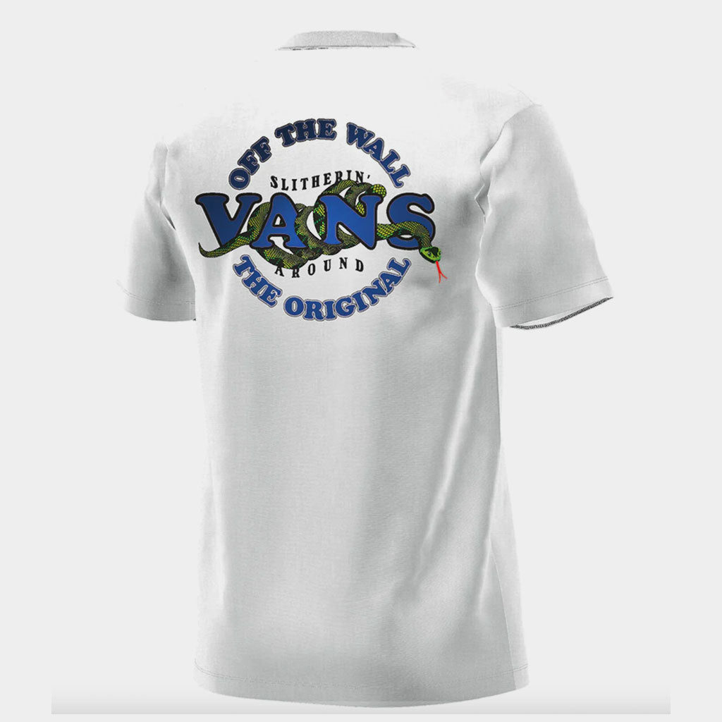 Weisses Vans T-Shirt mit blauem Vans Logo und Schlange hinten und vorne.